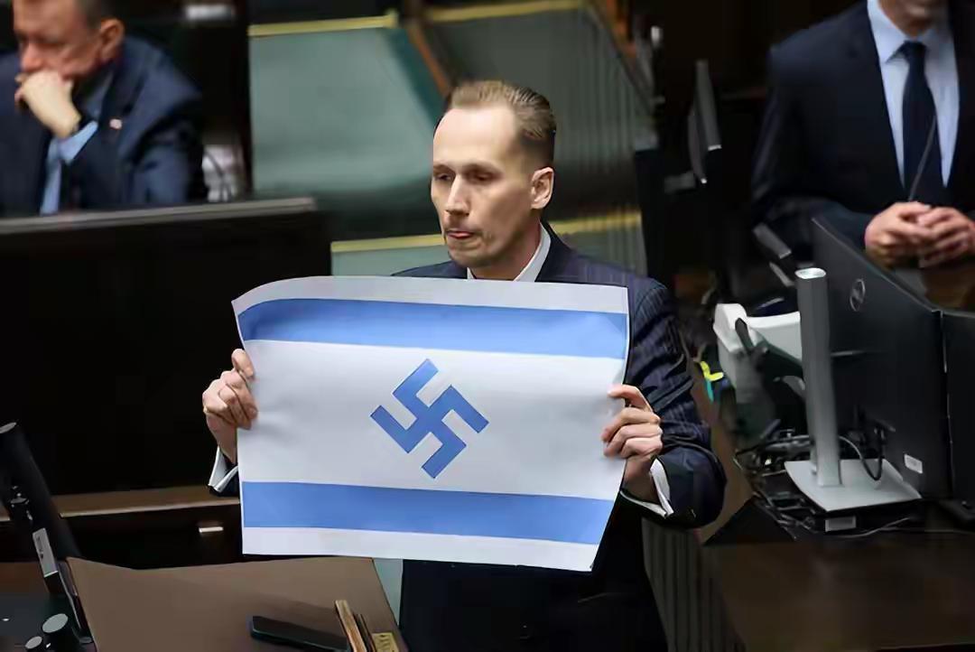 现场开炮!波兰议员当众嘲讽以色列:看好了,你们国旗长这样才对 一名波兰议员在波兰议会的公开会议上,直接拿出一张篡改后的以色列国旗图片展示,把原本代表犹太教的大卫之星,换成了纳粹的卐字标志,这波操作当场就炸了锅 。 这名议员叫康拉德·贝尔科维奇,来自波兰极右翼政党“自由与独立联盟”,事件发生在2026年4月14日,恰逢以色列大屠杀纪念日期间 。他在发言时公然宣称“以色列就是新的第三帝国,国旗就该长这样”,还指控以色列在加沙搞种族灭绝,使用白磷弹伤害平民。 议长恰扎斯蒂当场就厉声掐断了他的演讲,这种在议会使用纳粹标志的行为,在波兰是明确违法的,最高可判3年有期徒刑。波兰执政党随即要求启动刑事追责程序,议长也开始草拟纪律处分决议。 更让人愤怒的是时间点的选择,4月14日是“生命之路”大屠杀纪念游行期间,奥斯威辛集中营就在波兰境内,这里曾有超过300万犹太人被纳粹杀害 。贝尔科维奇用纳粹符号攻击以色列,本质上是拿波兰自己的历史伤痛当政治武器,这种行为极其自私且无知。 以色列驻波兰大使馆第一时间发布声明,痛斥这是“反犹太主义的恐怖行径”,是对犹太民族和大屠杀历史的严重冒犯 。以色列方面还要求波兰政府严惩贝尔科维奇,并公开道歉,否则将影响两国关系。 波兰国内也炸开了锅,不少民众和政治人士批评这名议员的做法极端且不负责任 。波兰外交部明确表态,这种行为不仅冒犯了犹太人和以色列人,也冒犯了所有重视大屠杀记忆的人。 贝尔科维奇的行为根本不是什么勇敢发声,而是彻头彻尾的政治表演。他拿纳粹符号做文章,既解决不了巴以问题,反而会激化矛盾,让波兰的国际形象蒙羞。真正的和平需要理性对话,不是靠这种哗众取宠的挑衅手段。 说到底,这种行为就是为了博眼球、拉选票,用极端言论吸引关注。波兰的外交政策本应基于历史正义和国际公理,而非一时的政治算计,这种错误言行不该被纵容。 各位读者你们怎么看?欢迎在评论区讨论。