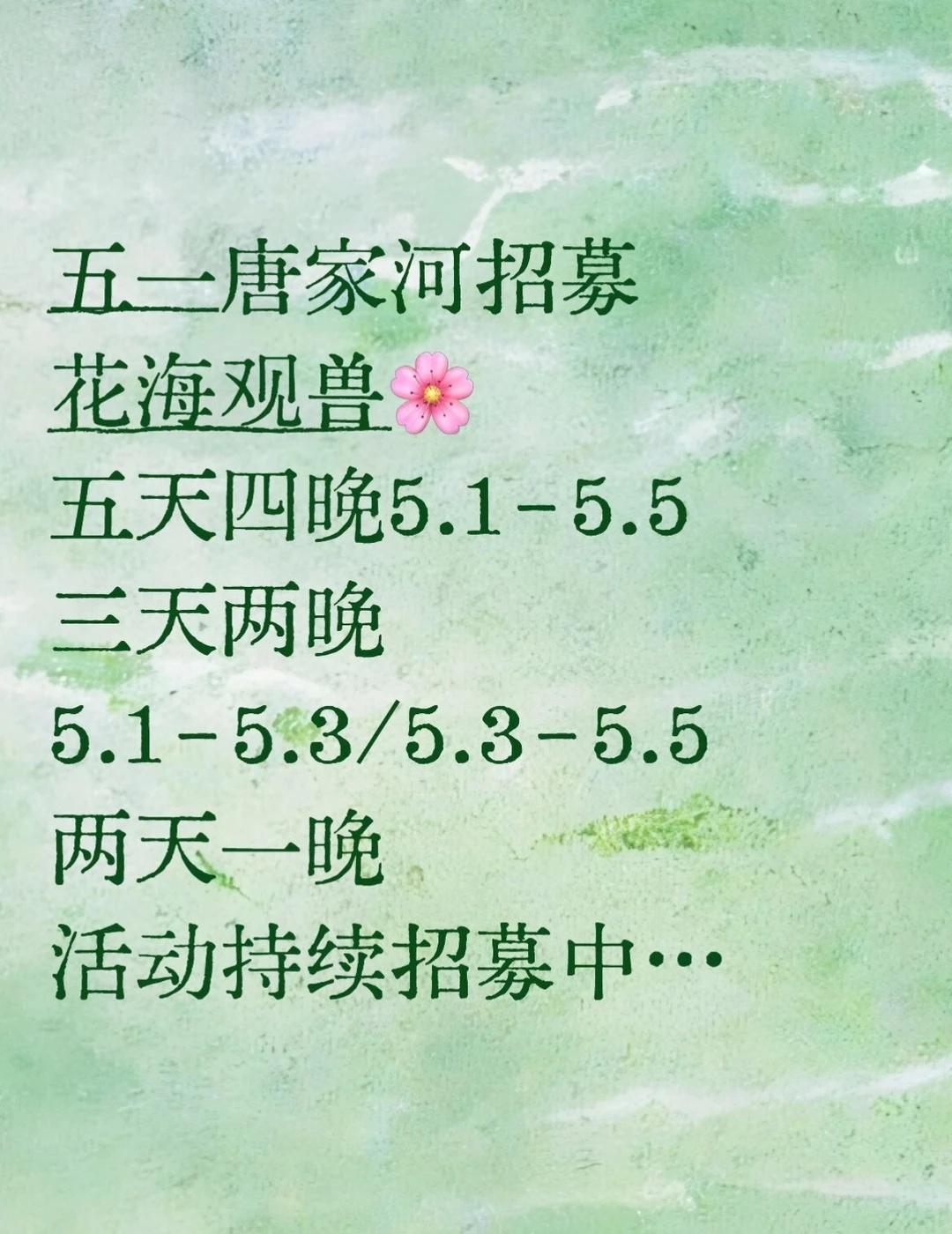 五一招募 | 来唐家河观花观鸟观兽! 这个五一,让我们一起走入西南山地中的唐家河,看见世界本来的样子。 唐家河的五一,是花的盛宴,也是绿的狂欢。 春花还未褪尽最后一抹温柔,夏花已悄悄地探出脑袋,杜鹃、芍药、鸢尾,一簇簇、一丛丛,顺着山坡铺展开来。 🌿 兽影寻踪 五一不冷不热,正是唐家河野生动物最活跃的时节!它们藏在山林间、河谷旁,悄悄等待着与我们的邂逅👇 大草坡上,羚牛慢悠悠踱步,旁若无人地啃食青草;密林深处,小麂一闪而过,像一阵轻快的风;雅鱼潭附近,说不定能偶遇正在捕食的水獭,灵动又可爱🦦 暮色降临后,我们会开展夜间观测活动,在专业导师指导下,寻找暗夜里的自然精灵,解锁唐家河的另一面! 👨🏫 专家同行 全程有动物专家、资深自然导师同行,他们是山野的知己,更是生灵的守护者🌟 跟着导师深入唐家河,学习辨认林间兽踪——黑熊留下的取食平台、小麂细碎的蹄印、豪猪掉落的尖刺,每一道痕迹,都是生灵走过的印记。还能亲手布设红外相机,体验科研巡护的乐趣,静待那些不轻易露面的生灵,记录下豹猫、斑羚、野猪等兽类的身影,把自然奇遇带回家📸 📅 五一活动团期 ✅ 5天4晚:5月1日-5月5日 ✅ 3天2晚:5月1日-5月3日 / 5月3日-5月5日 ✅ 2天1晚:4月30日-5月1日 / 5月1日-5月2日 / 5月2日-5月3日 / 5月4日-5月5日 💡 招募亮点 ✔️ 避开五一人群,沉浸式感受山野静谧 ✔️ 花海+兽踪双体验,承包初夏所有浪漫与惊喜 ✔️ 专家全程带队,解锁专业自然知识 ✔️ 亲手布设红外相机,体验科研巡护 ✔️ 夜间观测活动,解锁暗夜里的自然精灵 👨👩👧👦 适合人群 亲子家庭、5岁以上自然爱好者、想远离城市喧嚣的你! 五一 五一出游 唐家河 唐家河攻略 唐家河自然教育 青野生态 探秘大自然 山湖赏花观鸟季 唐家河鸟兽物语