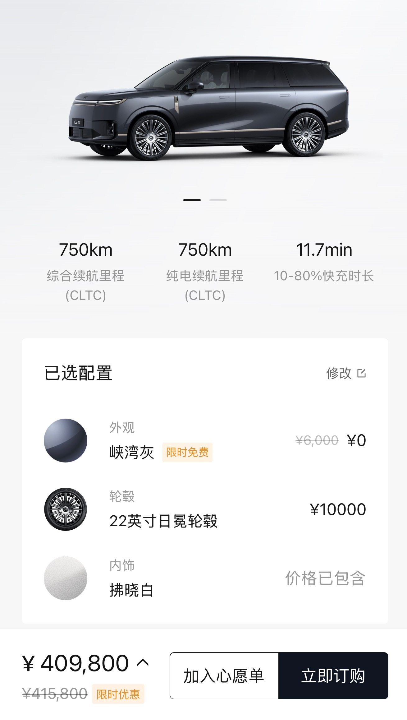 按照习惯选了一下配置,发现这个22英寸车轮还是有必要的(好看),别的都不用加钱,因为配置都一样,也不用分析哪款更值了(纯电/增程可以自己纠结一下)。汽车配置如何选