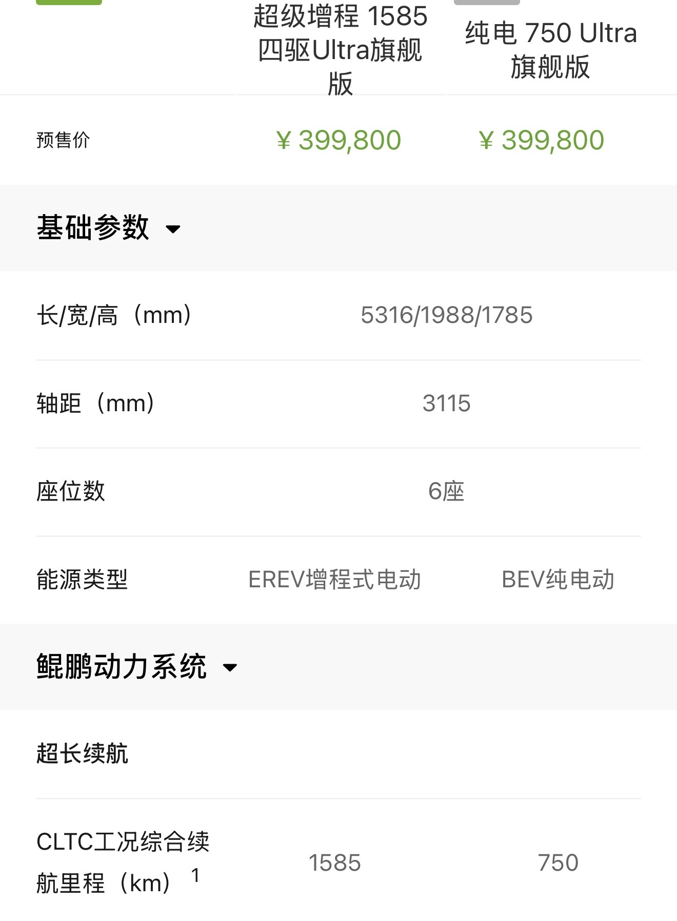 纯电版110度电,续航750公里/增程版63.3度电+1.5T增程器。标配线控底盘(转向和制动)+后轮转向+双腔空气弹簧+连续可变阻尼减振器。