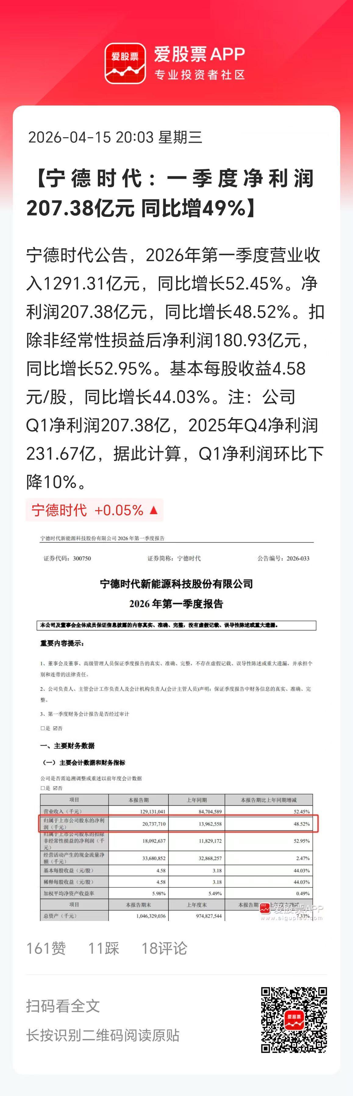 宁德时代一季度业绩炸裂,净利润207.38亿元,同比增长48.52%。按照这个业绩增速,宁王今年大概率赚1000亿,现在市值2万亿,20倍PE确实是不贵的! 今晚宁王还放了两个利好,一是将于4月21日19:00举办2026年宁德时代超级科技日,据说会有比较惊艳的产品,拭目以待;二是300亿元设立时代资源集团,向上游关键原材料扩张,这是要全产业链吃通啊。 前几天爱股君发过北向资金持仓市值,外资持有宁德高达3058亿元,第二名的茅台才851亿元,中际旭创才441亿元。外资看好宁王,原因就是它是稀缺龙头,看好新能源都绕不开宁德,全球就此一家!