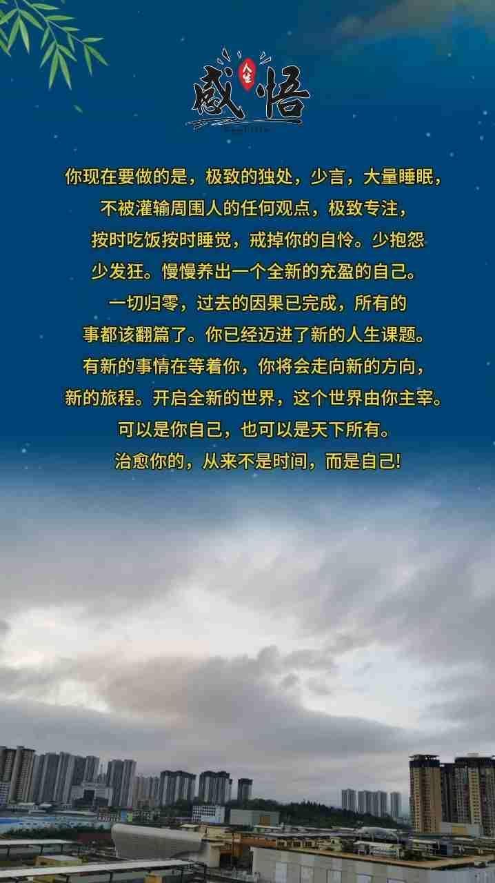 我的今日状态:😪没睡醒 我这里的天气:🌈雨过天晴 你现在要做的是,极致的独处,少言,大量睡眠,不被灌输周围人的任何观点,极致专注,按时吃饭按时睡觉,戒掉你的自怜。 少抱怨少发狂,慢慢养出一个全新的充盈的自己。 一切归零,过去的因果已完成,所有的事都该翻篇了。你已经迈进了新的人生课题。 有新的事情在等着你,你将会走向新的方向, 新的旅程。开启全新的世界,这个世界由你主宰。 可以是你自己,也可以是天下所有。 治愈你的,从来不是时间,而是自己! 带定位分享生活 带定位生活日常 空气凊新的一天 早晨起来的心情 安顿自己心得 晨起时的天空 今天依然是自己