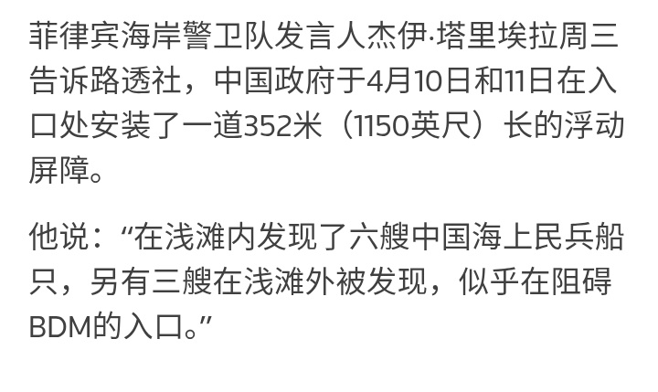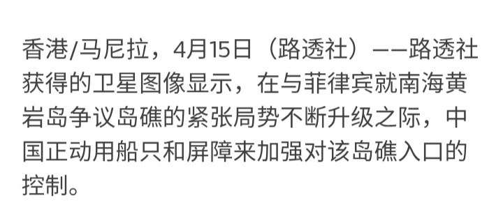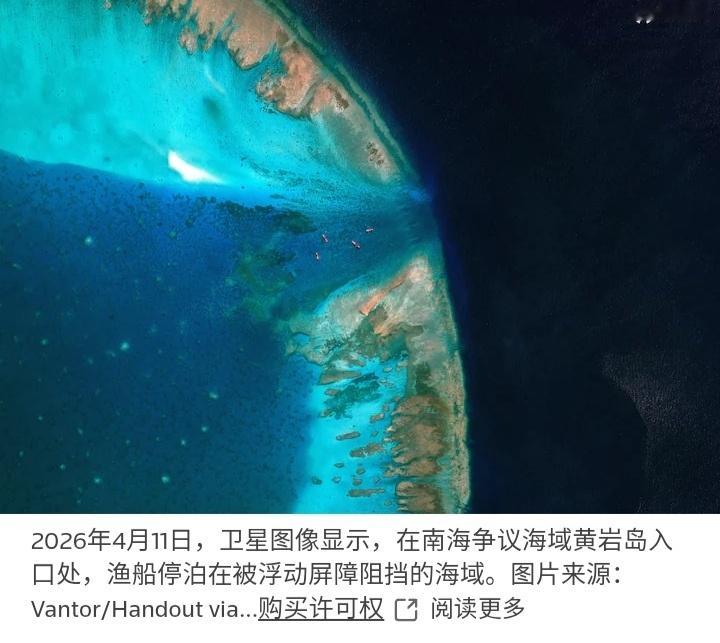 路透社称,卫星图像显示中国正动用船只和屏障来加强对黄岩岛入口的控制。