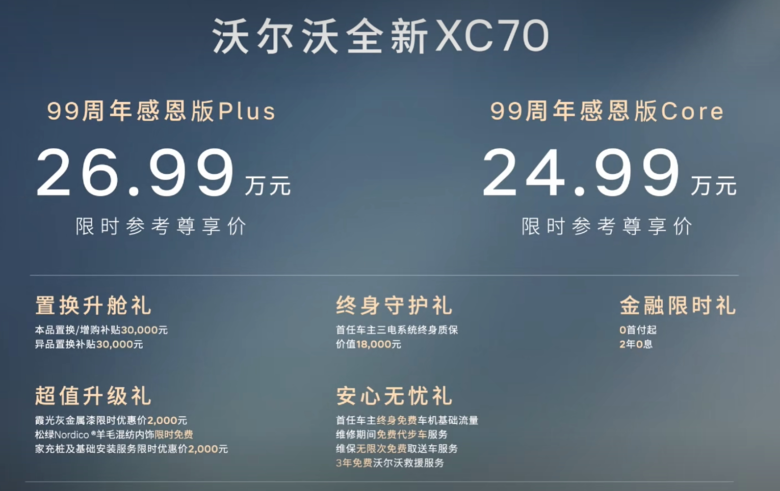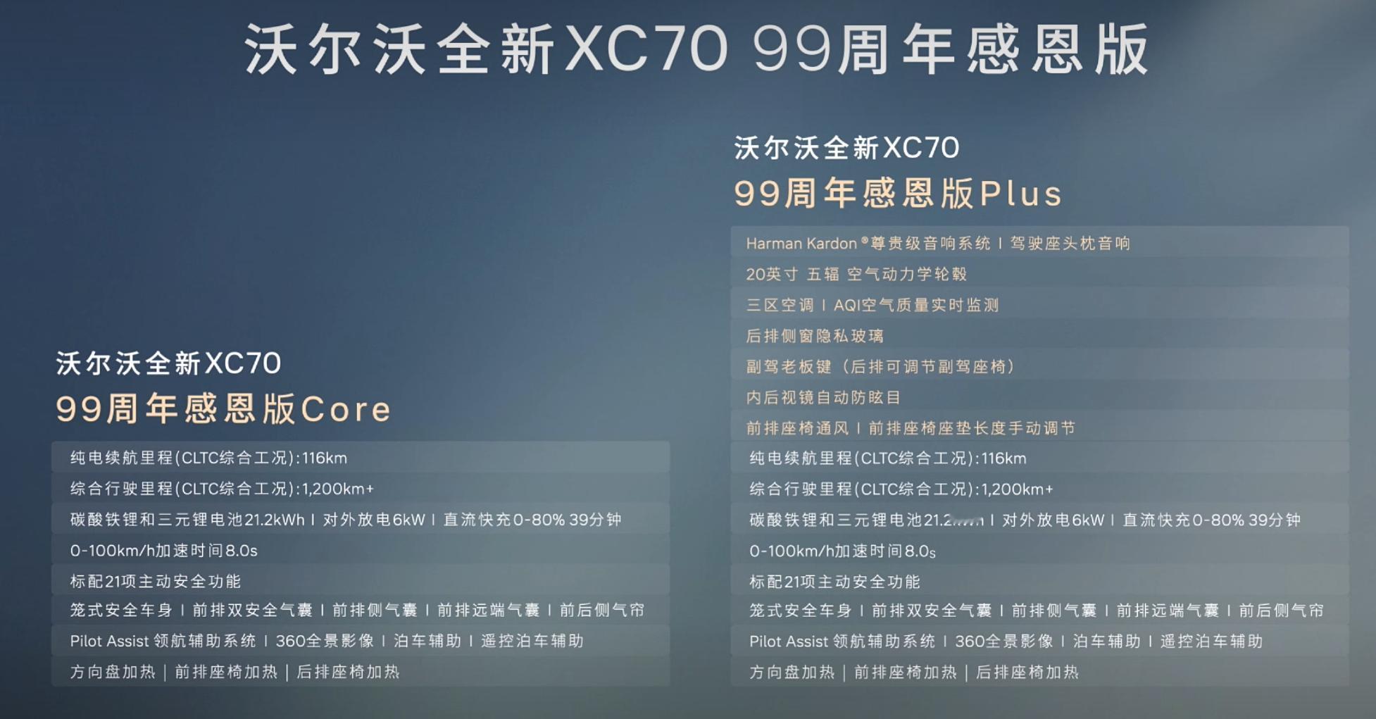2个配置(插混型):24.99万 99周年感恩Core116km/21.2kWh电池/零百8s/Pilot Assist领航辅助驾驶(L2)360全景影像/泊车辅助/遥控泊车/外放电6kW前后座椅加热/方向盘加热26.99万 99周年感恩版Plus20寸空气动力学轮毂/哈曼卡顿音响+头枕音响三区空调+AQI空气检测前排座椅坐垫+前排通风/后排私隐玻璃/后视镜防眩目/副驾老板键/后排私隐玻璃不到30万买沃尔沃豪华车,这还要啥自行车啊。100多公里的续航日常代步也够用,主要跑油的话,插混还能省一些,空间也够,内饰无异味,安全性也足够,总体还OK?