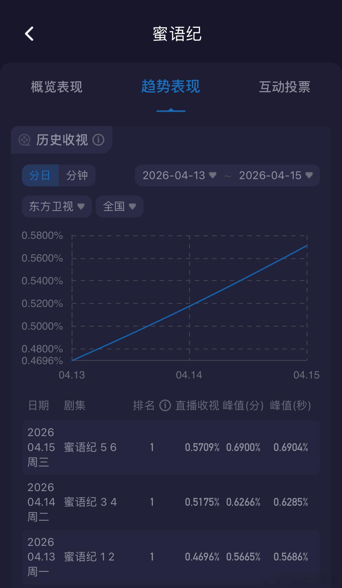 蜜语纪酷云收视率 0.5709%,峰值0.6904%开播三天都三涨,东方暂年冠看着也挺稳