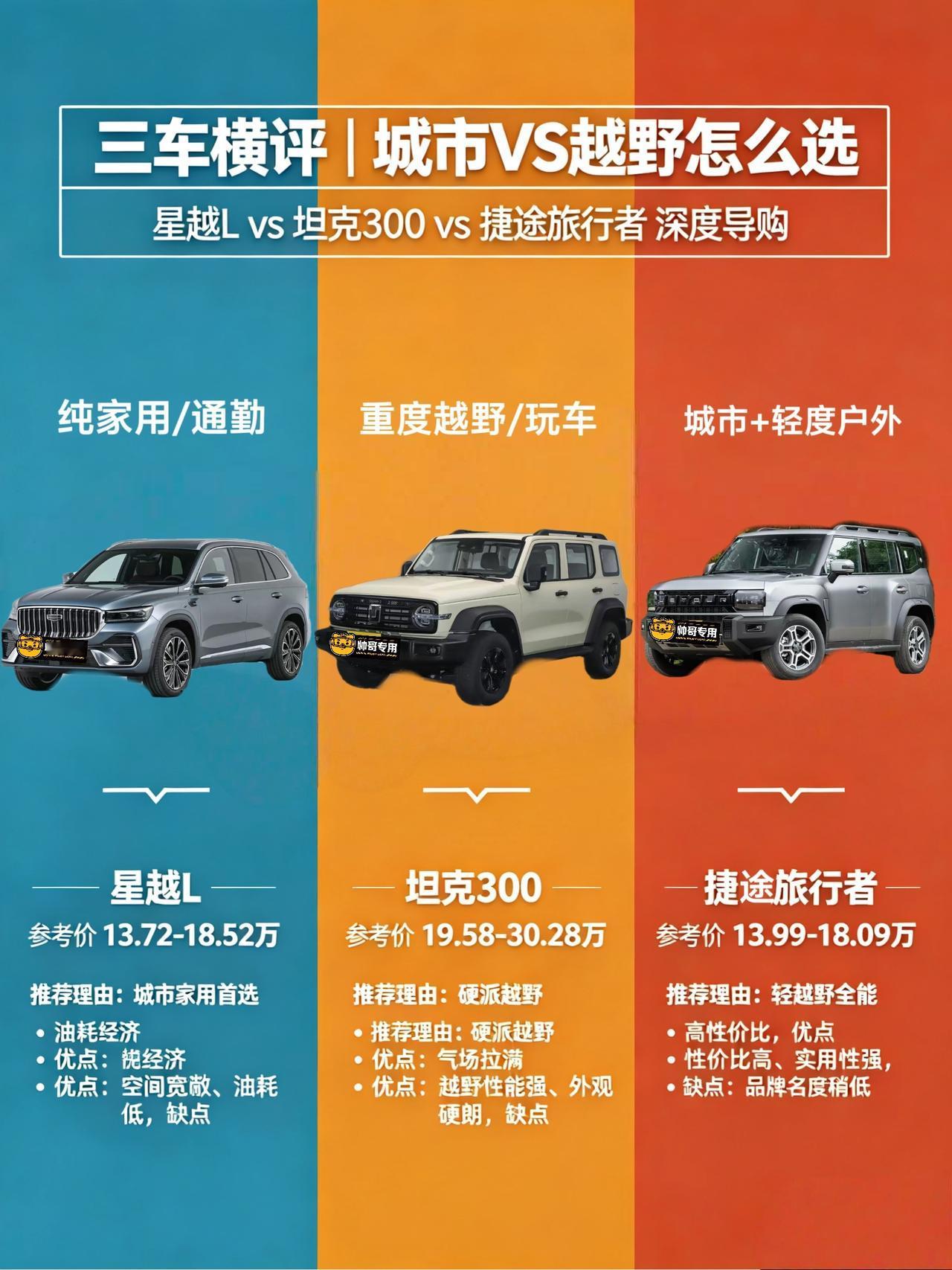 星越L、坦克300、捷途旅行者三车怎么选? 最近不少朋友问星越L、坦克300和捷途旅行者该咋选,今天不整参数,就掏点真心话,结合日常用车场景好好唠唠,保证看完心里有数。 先给个核心结论:追求城市家用舒适省心,选星越L;痴迷硬核越野、想要个性气场,冲坦克300;想兼顾轻越野和家用性价比,捷途旅行者就是最优解。下面咱掰开揉碎了说。 🏠 城市家用首选:吉利星越L 如果你的用车场景90%在城市,主打通勤、接娃、买菜,星越L绝对是闭眼选的类型。首先是空间,2845mm的轴距摆在这,后排坐三个成年人都能舒展开,后备箱塞下婴儿车、行李箱完全没问题,家用刚需直接拉满。 动力方面,2.0T高功率发动机匹配8AT变速箱,7秒多就能破百,超车时干脆利落,没有拖沓感。关键是油耗友好,日常市区开7个多油,还能加92号油,养车成本比同级别车型低不少。内饰做工也扎实,双联屏、智驾配置拉满,开着稳当,停车也方便,不管是新手还是老司机都能轻松驾驭。 🚜 硬核越野玩家:坦克300 要是你心里藏着个越野梦,周末总爱往山里跑、去露营,那必须选坦克300。方盒子造型自带硬派气场,停在路边回头率直接拉满,开出去特有面子。 核心优势就是越野能力,非承载式车身,高配车型配备三把锁,不管是烂路、河滩还是交叉轴,都能轻松应对,真正能带你去想去的地方。但咱也得接受它的“小脾气”,市区油耗12-13个,得加95号油,长期养车成本会高一些,低速起步也有点顿挫,后备箱空间也不如星越L规整。不过对越野爱好者来说,这些都不是事儿,毕竟能撒欢才是关键。 🚙 轻越野全能选手:捷途旅行者 如果你想玩点越野,但又不想太费油,也不想牺牲家用便利性,捷途旅行者绝对是性价比之王。它延续了硬派方盒子造型,颜值在线,2800mm的轴距比坦克300还宽裕,后排乘坐空间更舒适,家用完全够用。 动力上2.0T动力足够用,油耗比坦克300低不少,日常通勤更经济。配置更是没得挑,全景天窗、8155芯片车机、全景影像等实用配置一应俱全,还能享受终身质保,后期保养也省心。不管是日常代步,还是周末轻度越野、露营,它都能完美胜任,没有明显短板。 📌 最终选购建议 - 务实家用、看重舒适省心、养车成本:选吉利星越L - 硬核越野爱好者、追求个性气场:选坦克300 - 轻越野全能需求、兼顾家用性价比:选捷途旅行者 买车本来就是图个开心,结合自己的日常用车场景和预算来选,准没错!【来自懂车帝车友圈】