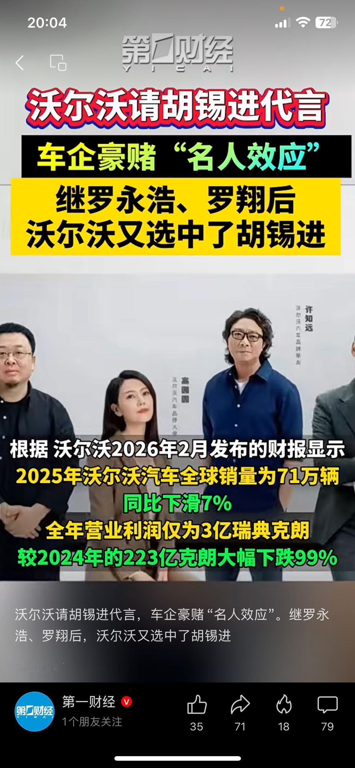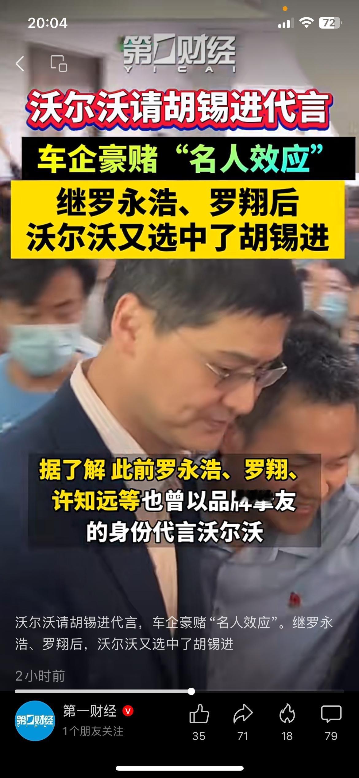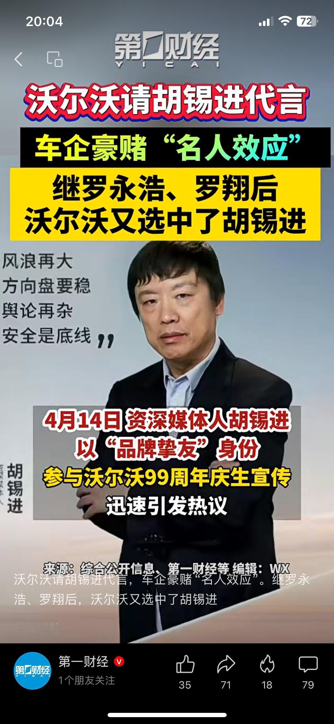 车企豪赌名人效应,沃尔沃这次选胡锡进,你怎么看? 沃尔沃4月14日官宣胡锡进担任品牌挚友,参与品牌99周年宣传,消息一出很快引发网友讨论。 这不是沃尔沃第一次牵手名人,之前罗永浩、罗翔、许知远都曾担任过品牌挚友,车企显然希望借助名人的影响力,提升品牌热度带动销量。 有人觉得胡锡进的风格和沃尔沃品牌调性契合,也有人持不同看法,车企扎堆绑定名人,到底能不能真正转化为销量,还得看市场反馈。 沃尔沃 胡锡进 车企代言 名人效应