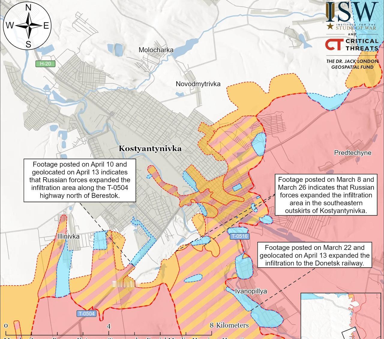 决战双子城之外围争夺:俄军在康城扩大渗透区 4月14日,俄罗斯军事博主称,俄军在卡列尼奇西北方向(斯拉维扬斯克以东)取得推进。同期,俄军在利曼及斯拉维扬斯克沿线发起全面袭扰:利曼市区周边、德罗比舍沃西北、斯塔夫基以北、奥泽尔涅东南、迪布罗瓦南部均遭俄军攻击;斯拉维扬斯克东侧,卡列尼奇、克里瓦卢卡周边及里兹尼奇夫卡、莱-亚历山德里夫卡方向战事密集,斯拉维扬斯克东南费多里夫卡、尼基福里夫卡亦遭俄军攻势。乌军随即展开反击,在迪布罗瓦、费多里夫卡、德罗比舍沃、尼基福里夫卡及亚罗瓦(利曼西北)多地实施反冲击,阻滞俄军推进节奏。 在康斯坦丁诺夫卡方向,俄军以渗透战术为核心展开多点布局。最新公布的3月8日、26日的地理定位视频显示,俄军在康斯坦丁诺夫卡南部及南郊扩大了渗透区域;4月10日,俄军在别列斯托克以北(康斯坦丁诺夫卡以南)再度开展渗透。3月22日,伊万诺皮利亚以西(康斯坦丁诺夫卡东南)的俄军也扩大了渗透行动范围。 4月13至14日,俄军将渗透与正面攻势结合,覆盖康斯坦丁诺夫卡全域及周边:康斯坦丁诺夫卡市区、新德米特里夫卡以北、明基夫卡东北及季霍尼夫卡方向、普列夏伊夫卡以南、伊利尼夫卡与斯捷潘尼夫卡西南、多哈巴尔卡以西均遭俄军攻击;德鲁日科夫卡东北普里维利亚、南部鲁辛亚尔、西南索菲伊夫卡、帕夫利夫卡、新帕夫利夫卡亦被纳入俄军攻势范围。 ( 图文部分参考战争研究所报告)