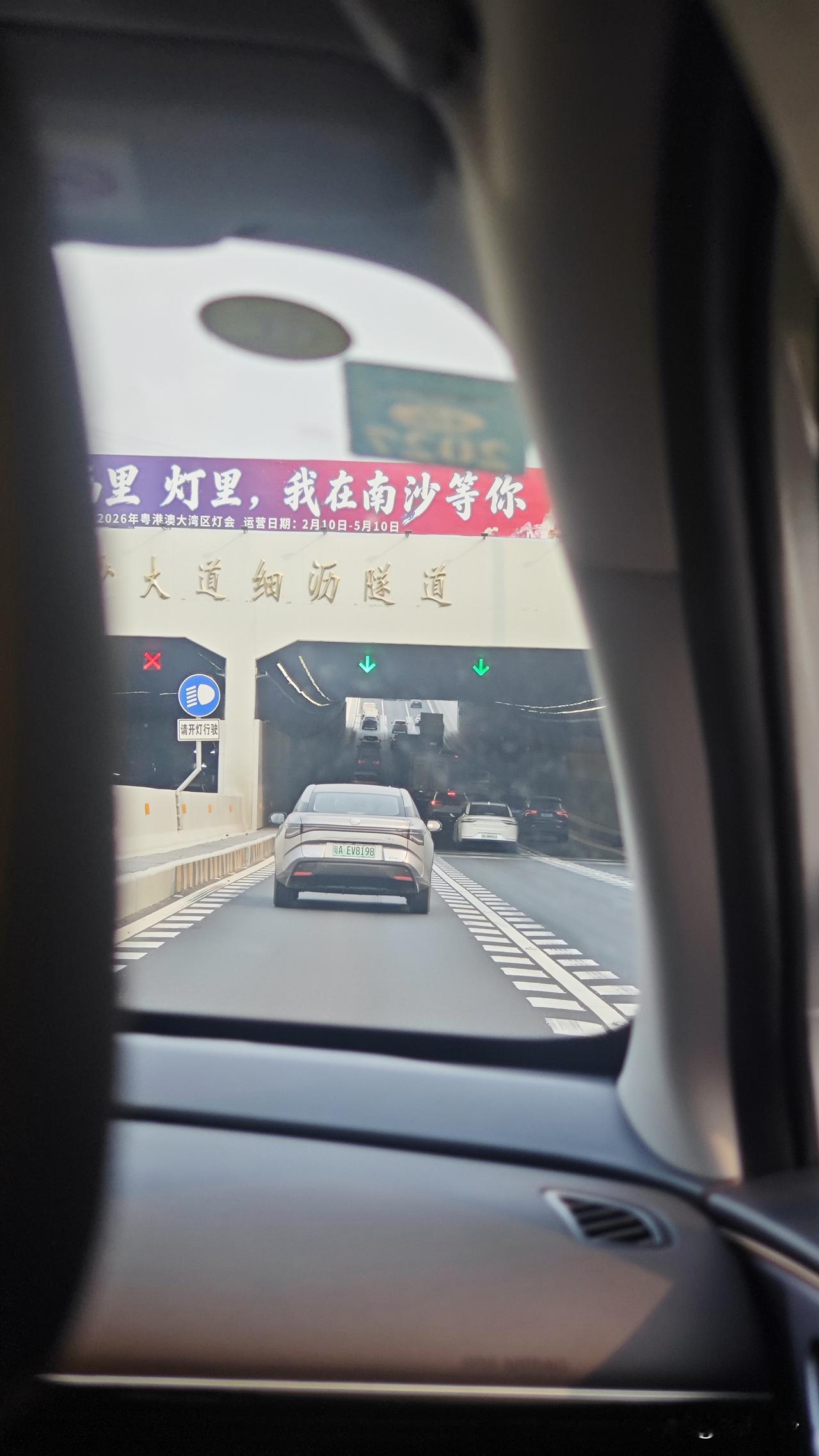 南沙大道著名的肠阻隔隧道,基本上进隧道开始就亮尾灯了,快要出隧道的时候也一波亮尾灯。
