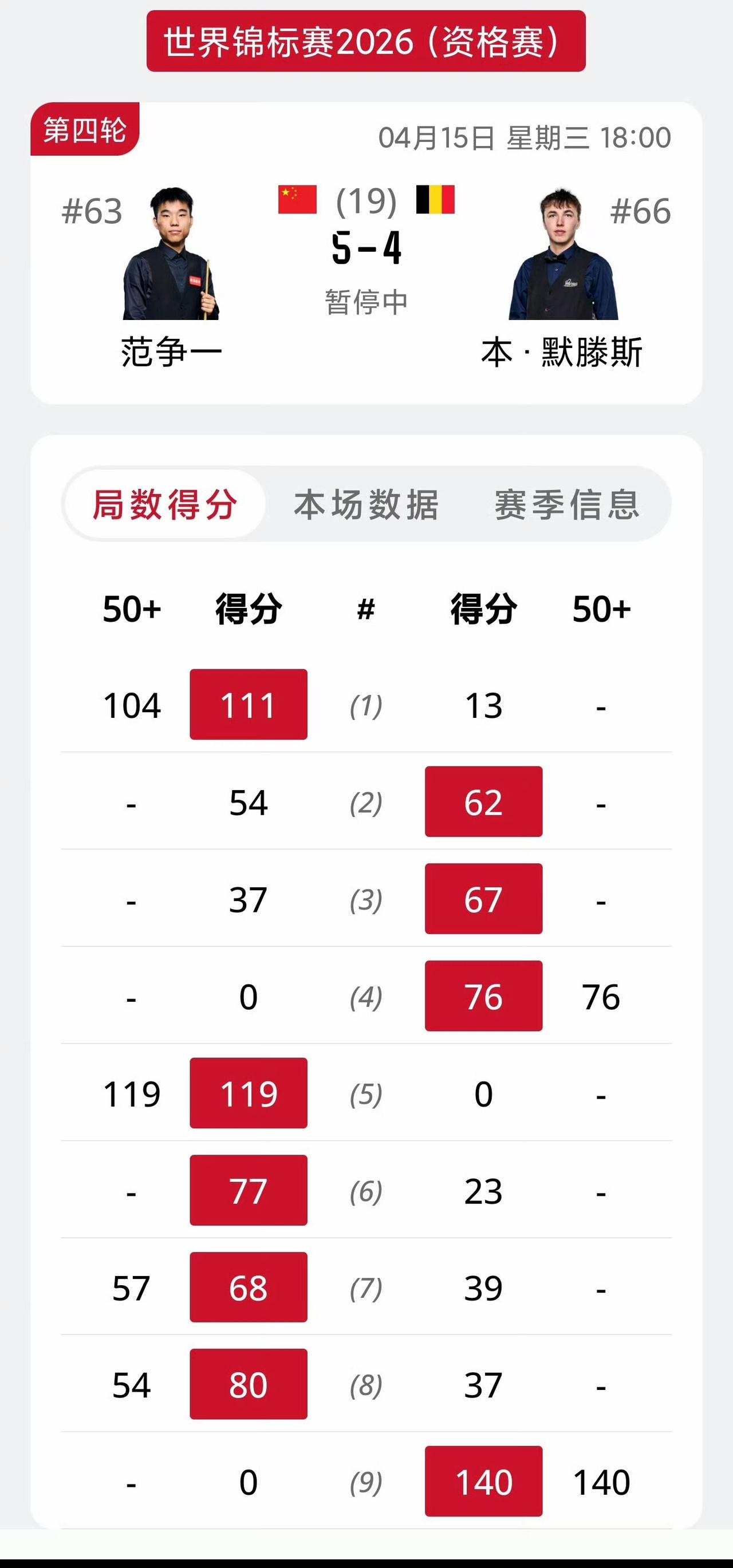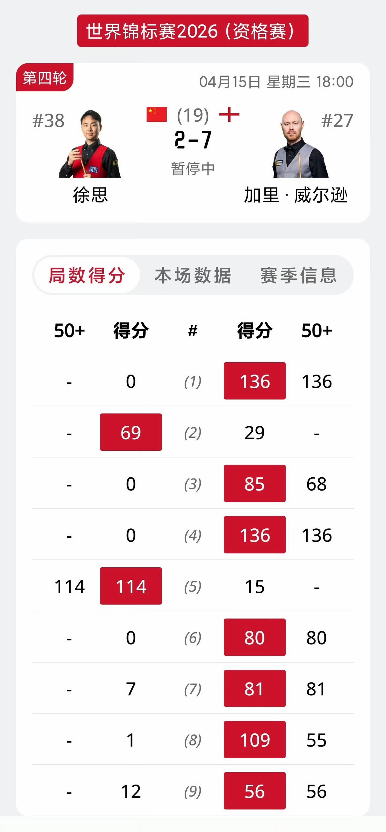 2026斯诺克世锦赛审判轮第一阶段结束,出战的5名球员要么大比分领先,要么小幅度领先,只有徐思太吓人了。 张安达8-1舒尔第 国强6-3小司机 雷佩凡5-4瑞恩戴 范争一5-4默滕斯 徐思2-7咖喱