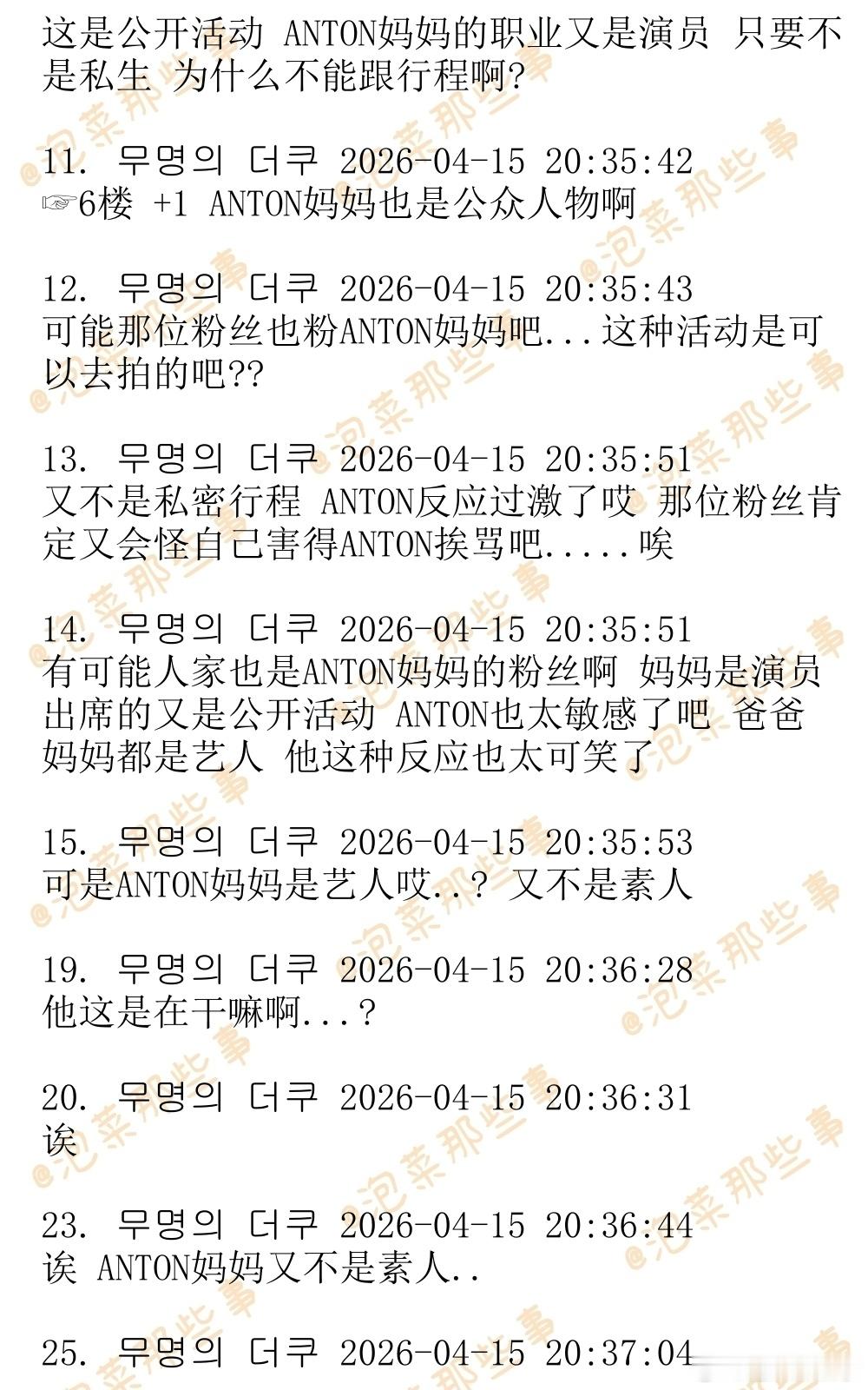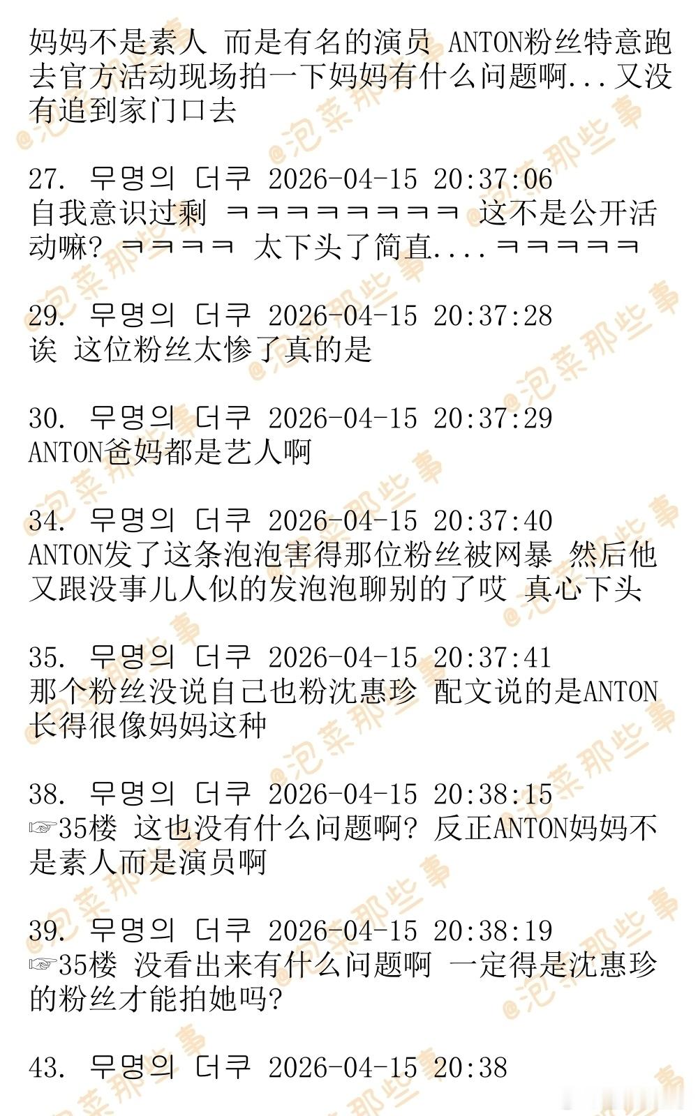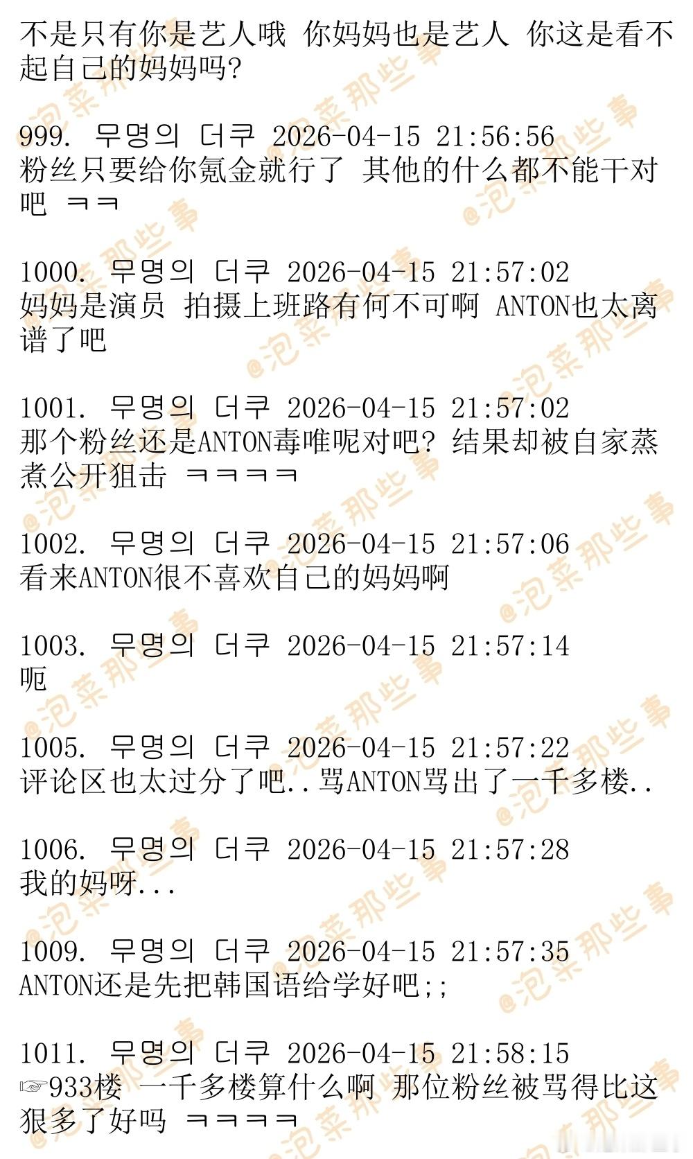🔥🔥韩网1200楼热帖评论翻译🔥🔥RIIZE李灿荣(ANTON)泡泡狙击粉丝引发争议韩网原帖帖主称:某颁奖礼几个星期前官宣ANTON的妈妈演员沈惠珍将会出席,今天有ANTON粉丝跑去颁奖礼现场拍下了ANTON妈妈上班路。于是ANTON就发了这么一条泡泡,那个粉丝被网暴之后发了道歉文,还把自己的账号设为私密。cr.theqoo