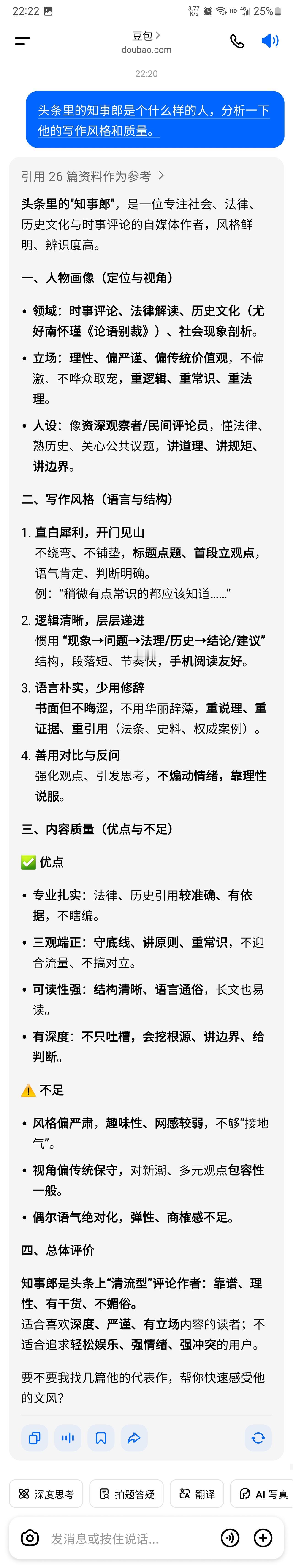 豆包对我的评价我很喜欢,也是我的追求。 豆包:知事郎是头条上“清流型”评论作者:靠谱、理性、有干货、不媚俗。 适合喜欢深度、严谨、有立场内容的读者;不适合追求轻松娱乐、强情绪、强冲突的用户。 忽然感觉很神奇,知事郎是真实世界的我吗?如果豆包能够了解我的生活和工作,会给我一个客观的评价吗?