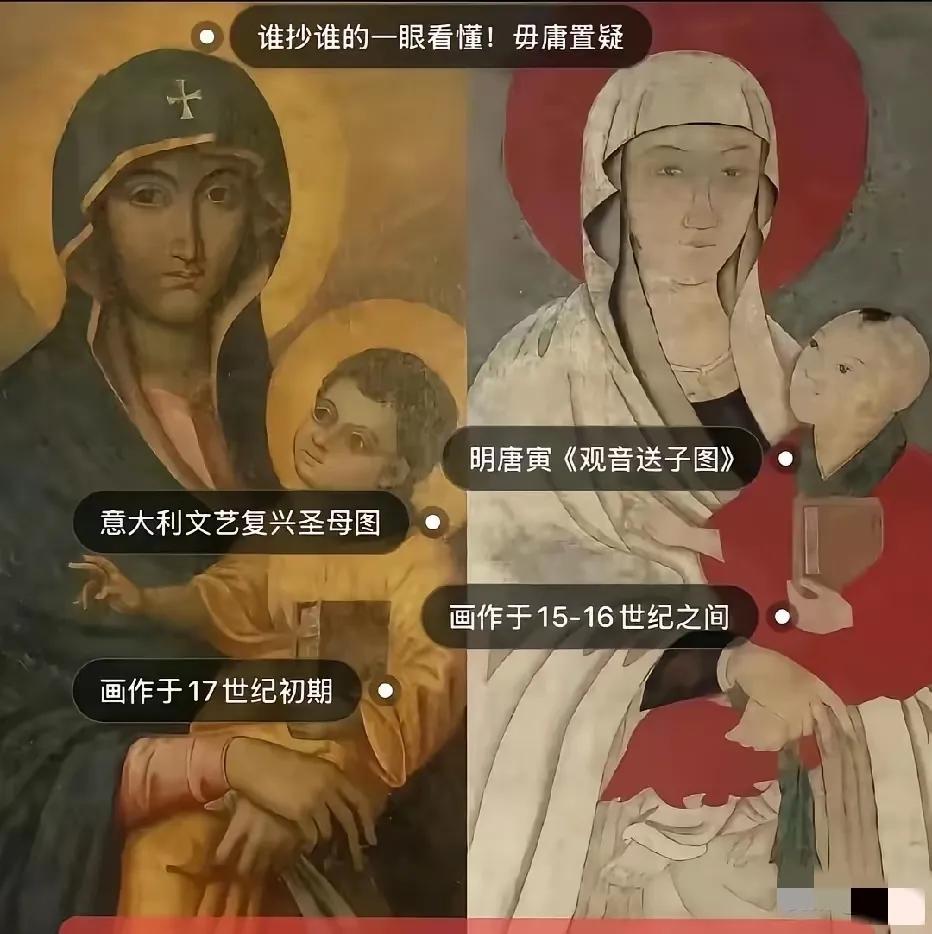 太震撼!中西古画撞脸绝非巧合 这对比看完直接惊呆了! 达芬奇《蒙娜丽莎》竟和明朝木美人画像神同步,神态、坐姿几乎一模一样,关键中国古画还早了上百年! 唐伯虎的观音送子图,更是和西方圣母画高度重合,仅换了孩童形象,中式留白、构图都没差。就连元代农书里的器械,也和西方后来的机器高度相似。 一幅是巧合,这么多作品、器物集体“撞车”,绝不是偶然! 古代中西方交流远超想象,西方艺术和技术,很可能借鉴了中国古代智慧,越细品越有深意!