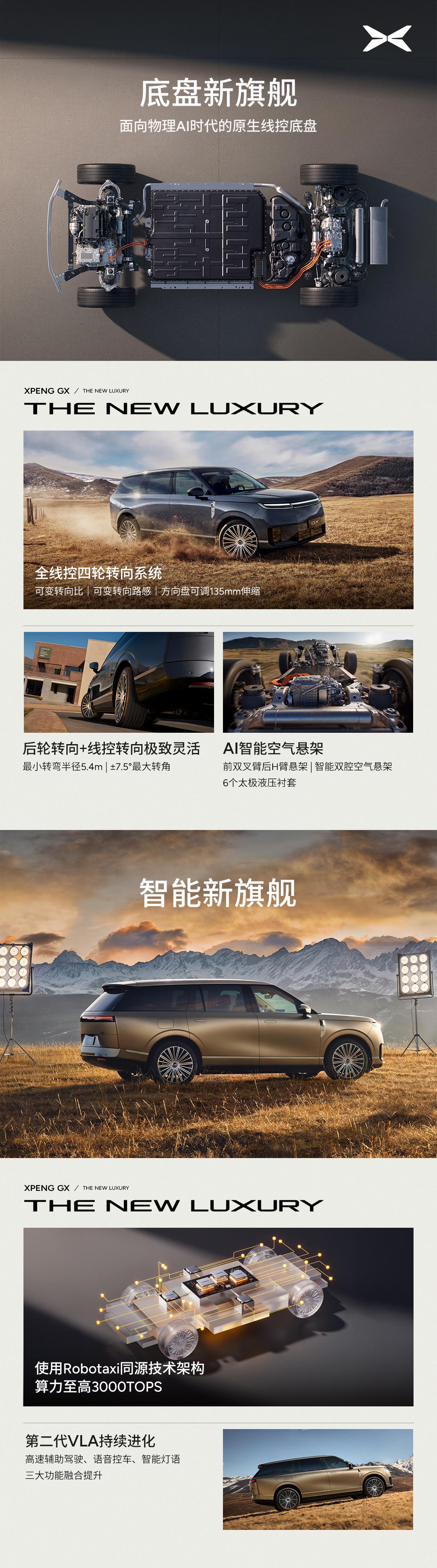 小鹏旗舰SUV GX开启预售,预售价39.98万元。 新车基于SEPA 3.0架构打造,定位全尺寸大六座SUV,是品牌技术体系的集大成者。GX提供纯电与超级增程双版本:纯电版四驱续航750km,超级增程版纯电续航430km,综合续航1585km。 在核心的安全方面,GX构建了完整的被动、主动与冗余三重防御体系。被动安全采用16000T一体式大压铸车身,配备11个安全气囊(含主驾三腔远端气囊、副驾超大容积气囊及贯穿式侧气帘),通过720°五重连环碰撞测试,覆盖三排防护。主动安全实现150km/h AEB制动与130km/h AES避让(含低附着力路面),搭载驾驶员失能辅助功能,可自动识别异常并执行靠边、救援流程。冗余安全引入航空级六重备份,覆盖线控转向、制动、驱动、通信、供电及解锁六大系统,单/多系统失效仍可维持基础控制。 驾控与智驾层面,GX搭载原生线控底盘,X-VMC系统融合驱动、制动、转向与悬架,智驾刹车响应80ms,支持冰雪、爆胎等工况稳定控制。智能驾驶系统以小鹏全栈自研前装量产Robotaxi原型车标准开发,依托3000TOPS超高算力平台,实现了第二代VLA园区漫游与VLM大模型的跨域融合,支持全场景通行、高速服务区自主泊车,并搭载AI数字投影大灯实现交互灯语。 在座舱体验上,GX致力于打造“移动智能家居2.0”。其AI无菌风冷双开门冰箱、0.16s极速变色的AI调光隐私玻璃及行业首创的静感柔风中央空调2.0,定义了健康舒适新标准。作为全球唯一支持三排电动全折叠的六座SUV,其空间组合极具灵活性,第三排可实现0-180°完全平躺,彻底告别“小板凳”体验。后备箱容积在六座常态下充裕实用,大四座模式更可拓展至极致装载状态。 GX的推出,标志着小鹏从功能叠加转向以“物理AI”架构为核心的系统级技术整合。【来自懂车帝车友圈】