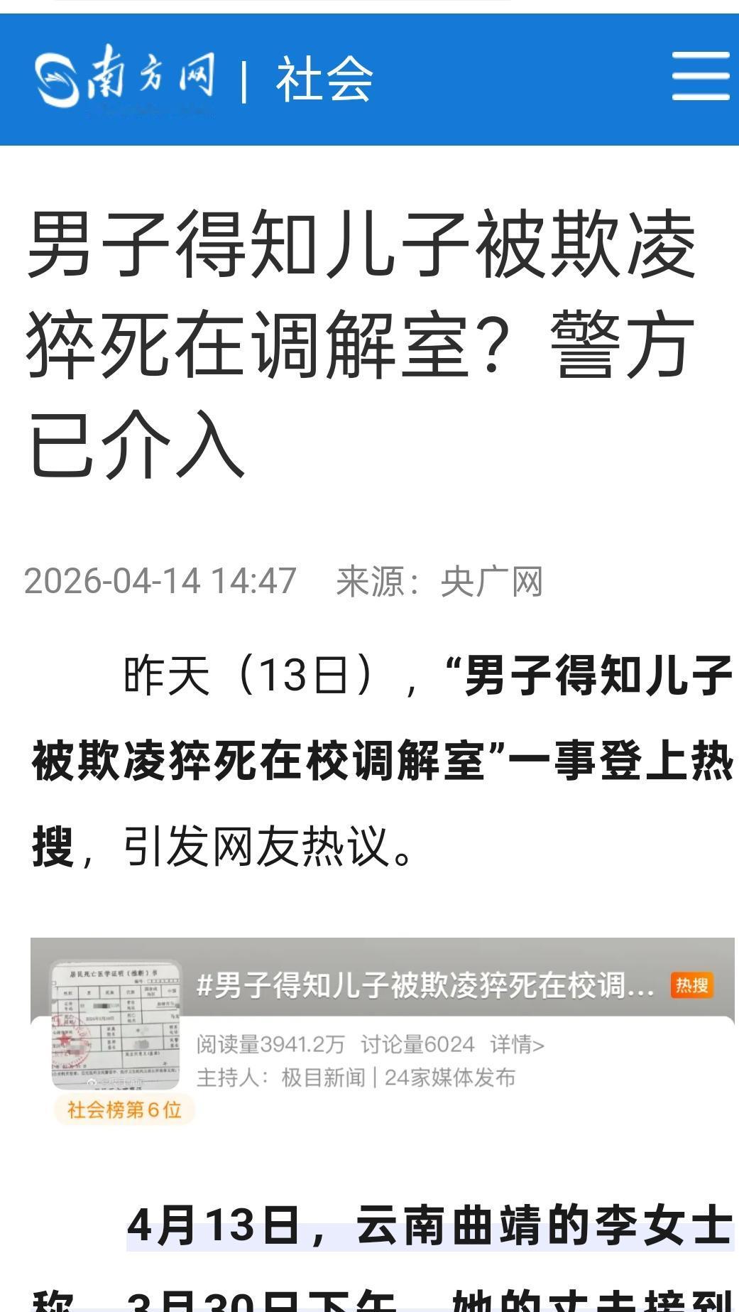 云南曲靖,一男子和妻子得知15岁儿子在学校被同学欺凌后,他们怒气冲冲地来到学校讨说法,由于男子情绪过于激动,在调解过程中男子突然倒地不起,没想到学校虽然提供了AED,但没人会用,等医护人员赶到现场时,男子已经身亡。目前,警方以及教体局均已介入调查。 信息来源:南方网 这事说起来真的太让人揪心了,好好的一家人,就因为孩子在学校受了欺负,去讨个公道的功夫,直接没了家里的顶梁柱,换谁都接受不了。 3月30号下午三点多,李女士和丈夫杨某就接到了班主任的电话,说儿子在学校被同学打了,让他们赶紧去学校配合调解。 夫妻俩一听就急了,儿子才15岁,平时在家宝贝得不行,自己都舍不得碰一下,居然在学校被人打了,当下放下手头的事就往学校赶。 他们是下午四点五十五分到的学校门口,四分钟后就见到了儿子、班主任还有对方家长。 后来几个人一起往调解室走,五点零八分正式进了调解室,准备好好说下孩子被欺负的事。 可不说还好,一说夫妻俩心都碎了。 原来儿子不是这一次才被欺负,从这学期开学就已经被盯上了。 最开始是几个同学堵着他要零食,孩子怕惹事就给了,结果对方看他好说话,越来越过分,后来直接开始要钱,不给就动手打。 甚至还有更过分的,孩子的宿舍床板都被人故意弄坏了,只能天天侧着身子睡觉,还有几次被人按在厕所隔间里威胁,不准他告诉老师和家长,不然就打得更狠。 这孩子也懂事,怕爸妈担心,就硬生生忍了两个多月,这次实在是被打得太厉害,老师发现了才通知了家长。 杨某本来就有高血压,平时一直吃药控制,看着儿子身上的伤,听着他这两个多月受的委屈,火气一下就上来了,脸色也越来越差。 进调解室才刚过六分钟,杨某话都没说几句,突然脑袋一耷拉,整个人直接倒了下去,一点意识都没有了。 旁边的儿子吓得直哭,一个劲喊爸爸,李女士也慌了,一边让班主任赶紧找学校的急救设备,一边赶紧打120。 学校很快就把AED送过来了,可在场那么多人,包括老师在内,没有一个人会用这个设备。 心脏骤停的黄金抢救时间就那四分钟,硬生生就这么耽误了。 李女士只能跟着120接线员的指示,给丈夫做心肺复苏,手都按麻了也没见人醒过来。 等急救人员几分钟后赶到现场的时候,杨某已经没有生命体征了,最后诊断是心源性猝死。 后来警方调了调解室的监控,确认整个调解过程只有6分钟,双方既没有吵架也没有肢体冲突,杨某确实是情绪激动诱发了疾病。 好好的人进了学校,转眼就没了,李女士整个人都垮了。 更糟的是,杨某的父亲本来就有病,听到儿子猝死的消息直接病情加重,现在都还靠呼吸机维持着生命。 事情到现在已经过去快半个月了,还是没有个明确的说法。 李女士找了学校好几次,校方前后调解了四次,始终说自己没责任,只愿意出于人道主义发动募捐给4万块,现在学校的负责人干脆联系不上,电话不接消息不回,杨某的遗体到现在都还没安葬。 现在网上大家讨论得最多的无非是两个事,一个是校园欺凌,一个是学校到底要不要为杨某的死负责。 先说说孩子被欺凌这个事吧。 按法律规定,学校发现学生被欺凌了,确实要立刻制止,通知双方家长来处理,这次班主任发现孩子被打之后第一时间通知了家长,这点做得没毛病。 但问题是,这孩子被欺负了整整两个多月啊,从要零食到要钱再到动手打人,甚至床板被弄坏、被堵在厕所威胁,这么多反常的情况,学校和老师居然一点都没发现? 要是能早一点发现孩子被欺负,早点干预,也不至于闹到家长来学校调解这一步。 如果学校平时根本没做过反欺凌的宣传,也没教过孩子遇到欺凌该怎么求助,那这个责任肯定是逃不掉的。 再说说杨某猝死这个事,现在最有争议的就是学校配了AED却没人会用,到底算不算失职。 有人说学校不是公共场所,没义务给外来的人提供急救保障,但你想啊,调解室本来就是学校给大家处理公共事务的地方,又不是私人场所,李女士夫妻俩是老师请过来解决问题的,学校肯定有基本的安全保障义务。 花钱配了AED,却从来没给老师做过使用培训,真到要用的时候变成了摆设,错过了最宝贵的抢救时间,这本来就是管理上的漏洞。 当然了,杨某本身有高血压,也是诱发猝死的主要原因,所以大概率是他自身承担主要责任,学校承担次要的责任。 说来说去,这事实在是太可惜了。 本来是为了给孩子讨公道,最后把自己的命都搭进去了,一个好好的家就这么碎了。 现在教体局已经成立了工作专班,警方也在调查,希望能给李女士一家一个公平的结果吧,也算是给逝者一个交代。 这事给所有家长提个醒,平时要多关心孩子,多陪伴他们,和他们聊天谈谈心,让他们有什么事要告诉父母,不要忍气吞声,否则孩子被欺负了家长也不知道,而家乡遇到事情也不要情绪激动,容易出问题。