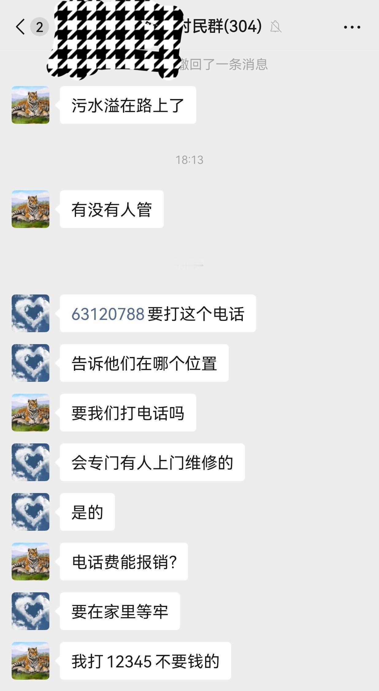 村里的“谁是谁非” 有村民在村民群里反应:污水满溢在村中道路上了,后面加了一句“(村里)有没有人管”。听起来有点质问的意味,意思是“有人管的话,应该管一下、落实到实际行动”! 没料想有位村干部三分钟后再群里发了一个保修电话号码,还说“要打这个电话,告诉他们在那个位置,会专门有人上门维修的”! 说实话,在20-30年前的话,反应情况的那位村民或许不会有什么异议,按村干部打电话让维保单位来修就是,而且大概率会这么做!但是现在的社会早已不是那个味了。村民的回复是“电话费能报销”? 不知道那位村干部是不是与我有不同的理解,他继续强调“要在家里等牢”!后面有了报料的村民的神回复“我打12345不要钱的”!让我恍然大悟,优秀、人才!