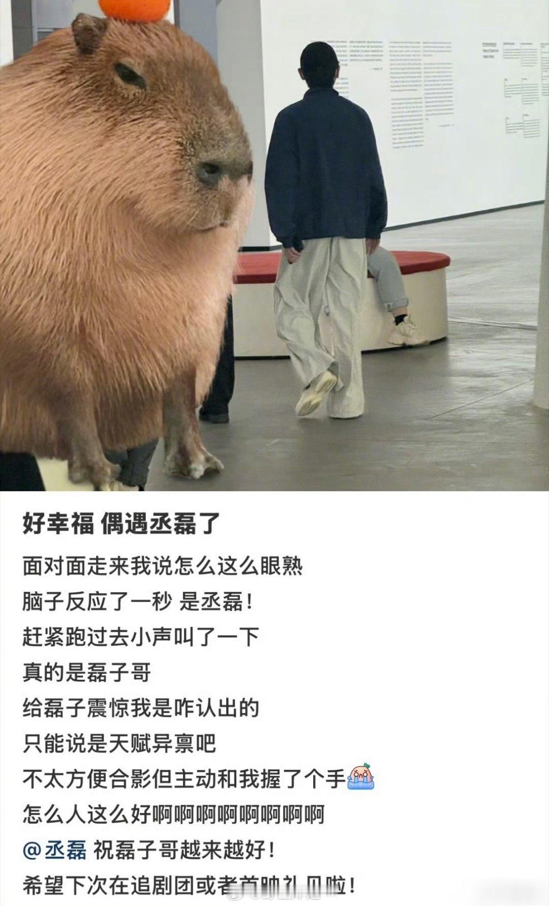 有网友偶遇到了丞磊去看展呢,说不太方便合影,但是有跟这个网友握手,也是真的很暖心窝窝啊