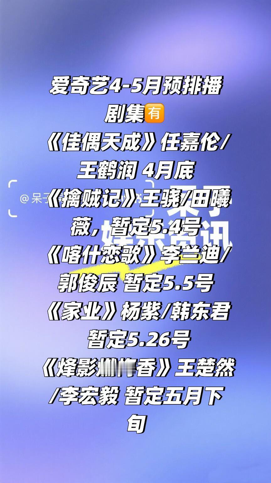 🥝爱奇艺4-5月预排播剧集🈶《佳偶天成》任嘉伦/王鹤润 4月底《擒贼记》王骁/田曦薇,暂定5.4号《喀什恋歌》李兰迪/郭俊辰 暂定5.5号《家业》杨紫/韩东君 暂定5.26号《烽影燃梅香》王楚然/李宏毅 暂定五月下旬