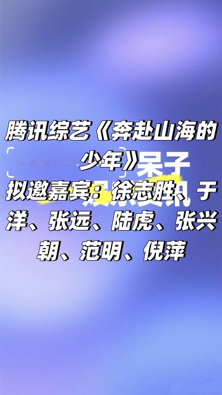 🐧腾讯综艺《奔赴山海的少年》阵容🐧综艺《奔赴山海的少年》拟邀嘉宾:徐志胜、于洋、张远、陆虎、张兴朝、范明、倪萍简介:一档关于“少年奔海”的少年成长纪实真人秀。5位少年从离海最远的大陆腹地出发,他们只有一辆房车和有限物资,以及一个遥远的目的地——大海,通过在途径补给站完成挑战任务,赢取里程,从而解锁目的地大海的坐标。这不仅是一段公路远行,更是一场积蓄力量奔赴山海,在实践中探寻与体验的少年成长!