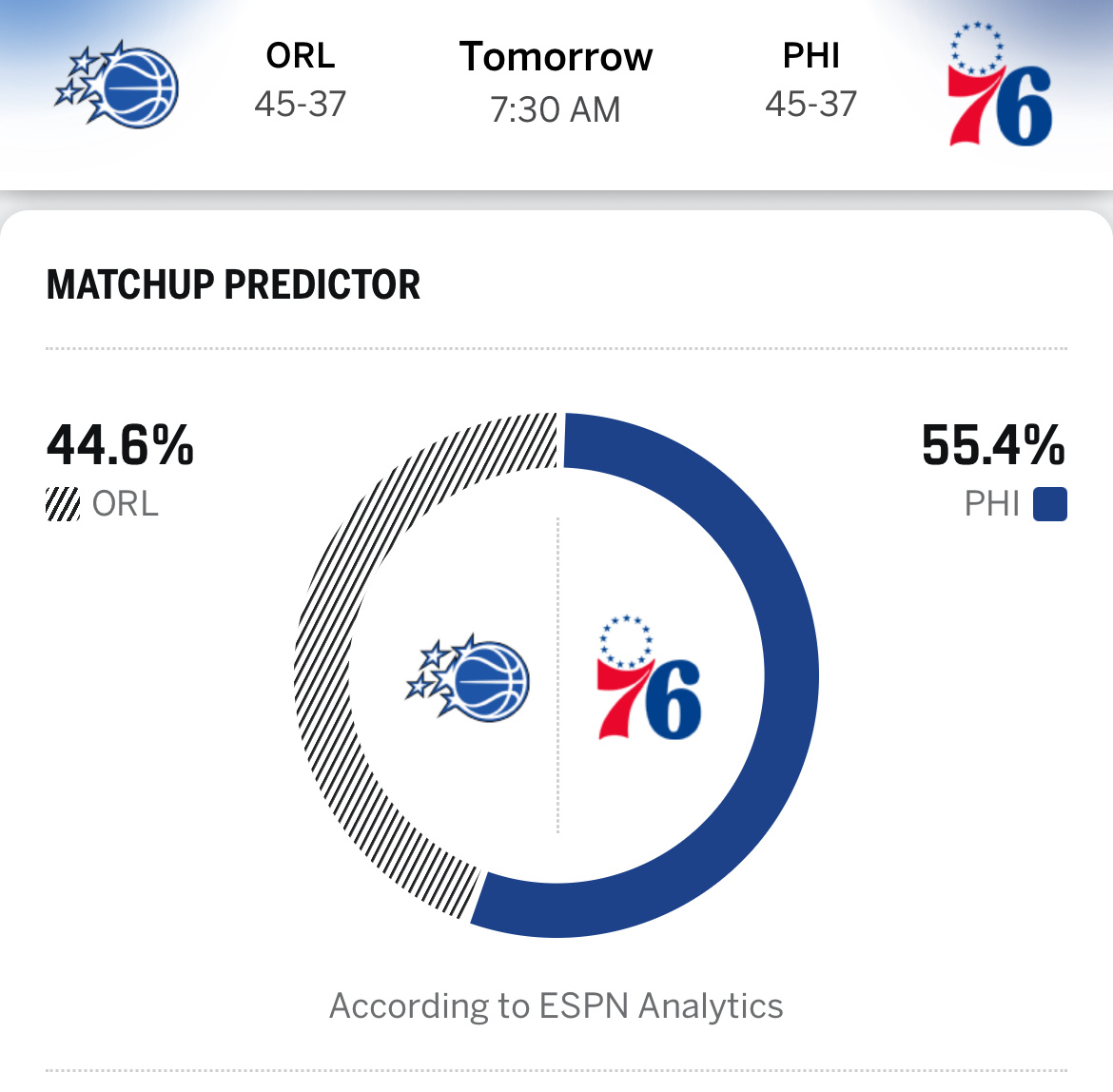 ESPN预测胜率:魔术44.6%,76人55.4%