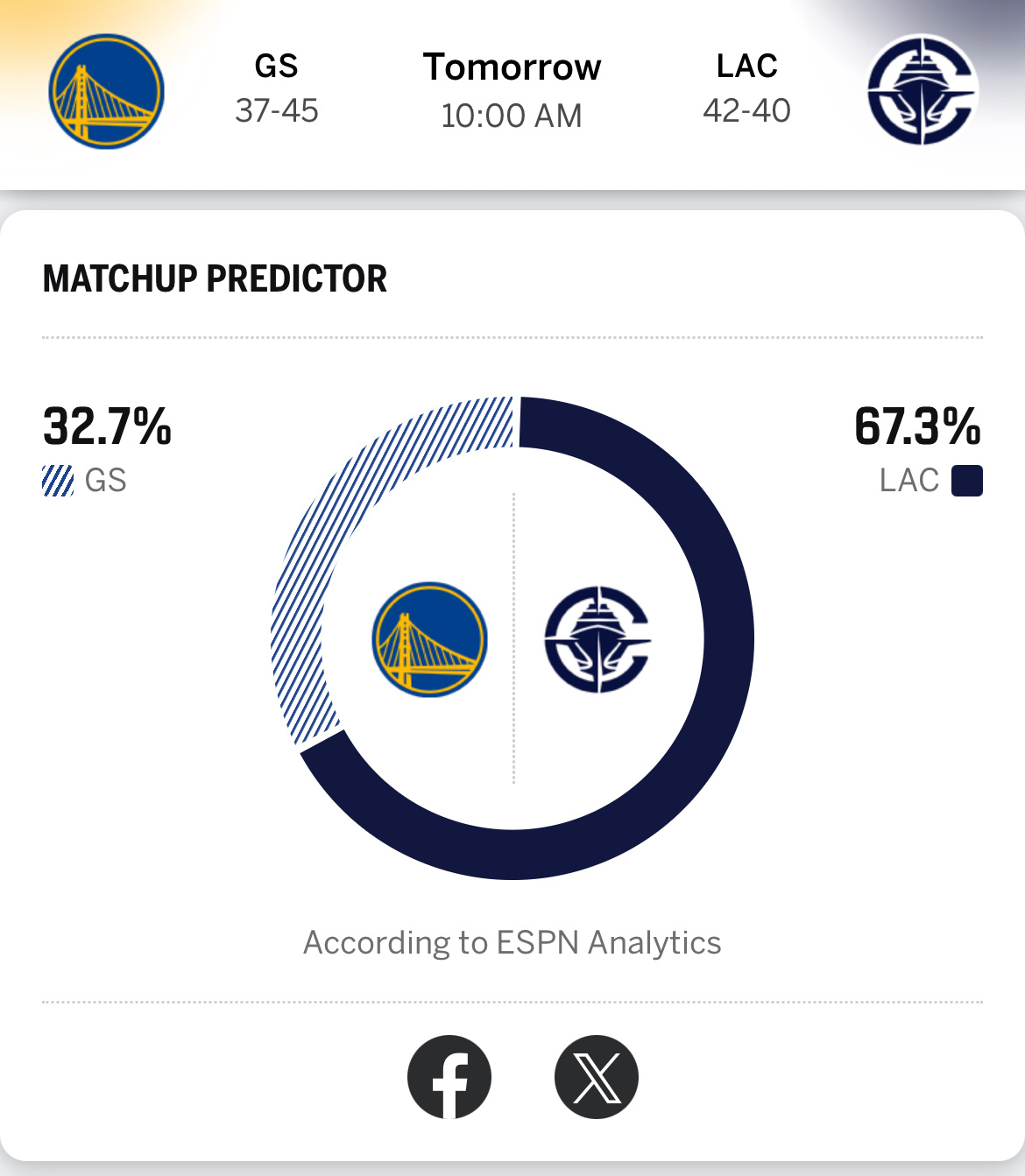 ESPN预测明天附加赛胜率:快船67.3%,勇士32.7%