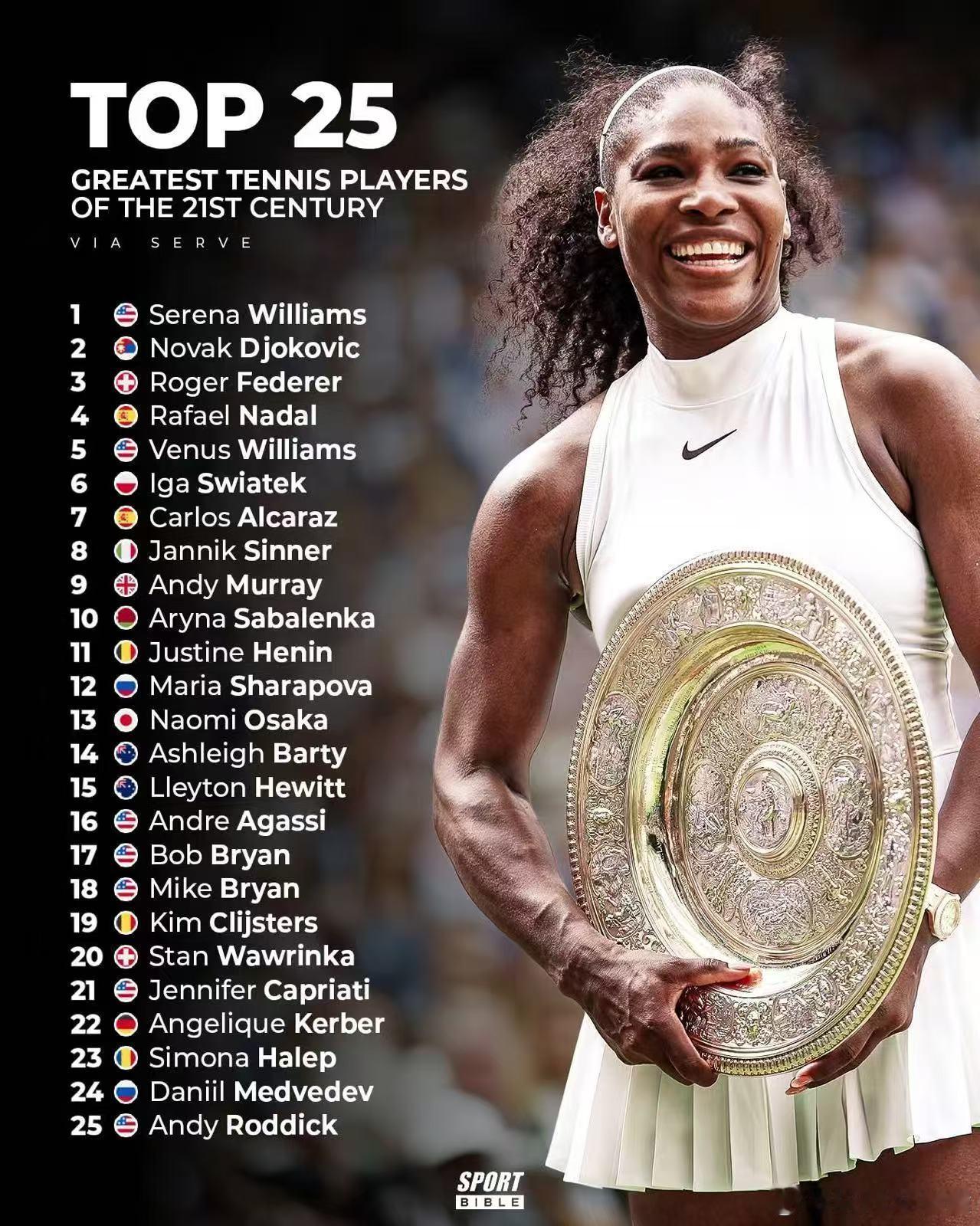 21世纪最伟大的25位运动员,有遗珠吗?1、小威2、德约科维奇3、费德勒4、纳达尔5、大威6、斯瓦泰克7、阿尔卡拉斯8、辛纳9、穆雷10、萨巴伦卡11、海宁12、莎拉波娃13、大坂直美14、巴蒂15、休伊特16、阿加西17、鲍勃-布莱恩18、麦克-布莱恩19、克里斯特尔斯20、瓦林卡21、卡普里亚蒂22、科贝尔23、哈勒普24、梅德韦杰夫25、罗迪克wtaATP红土撒野季
