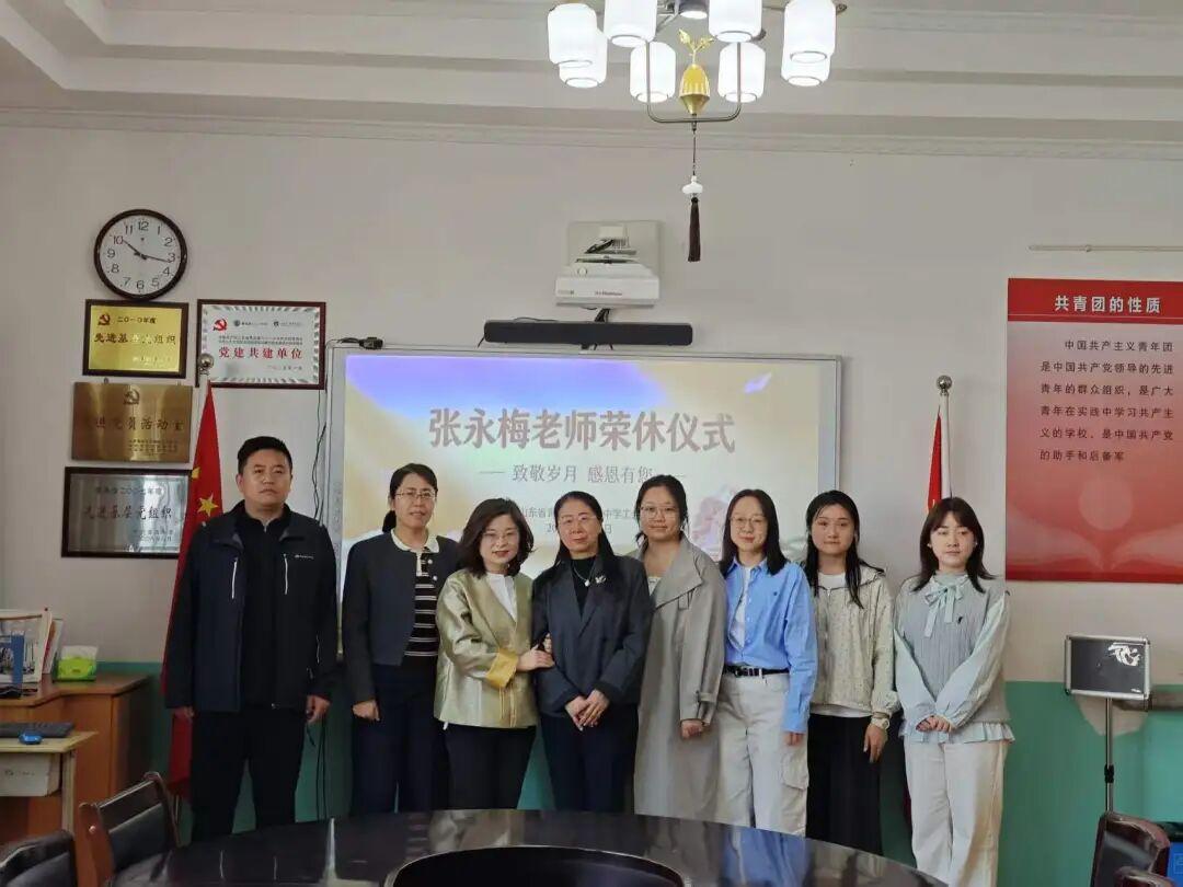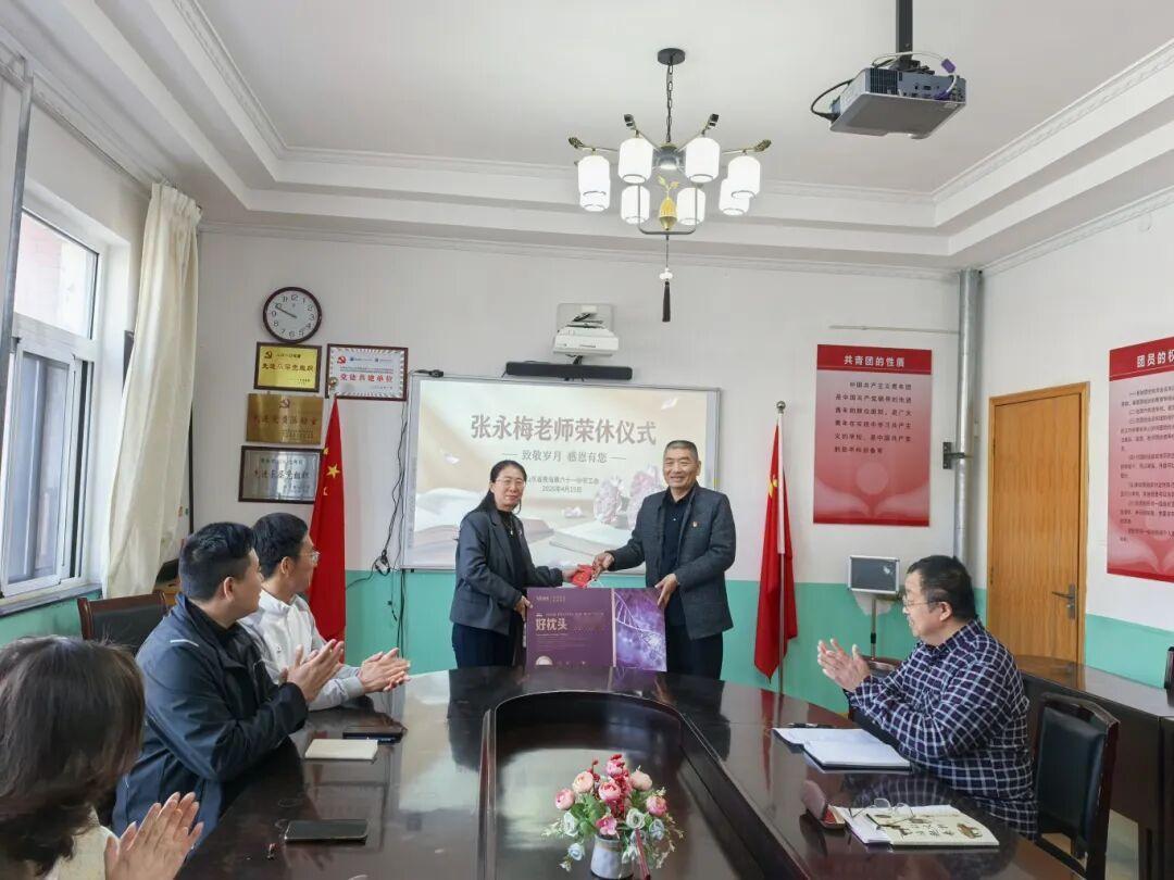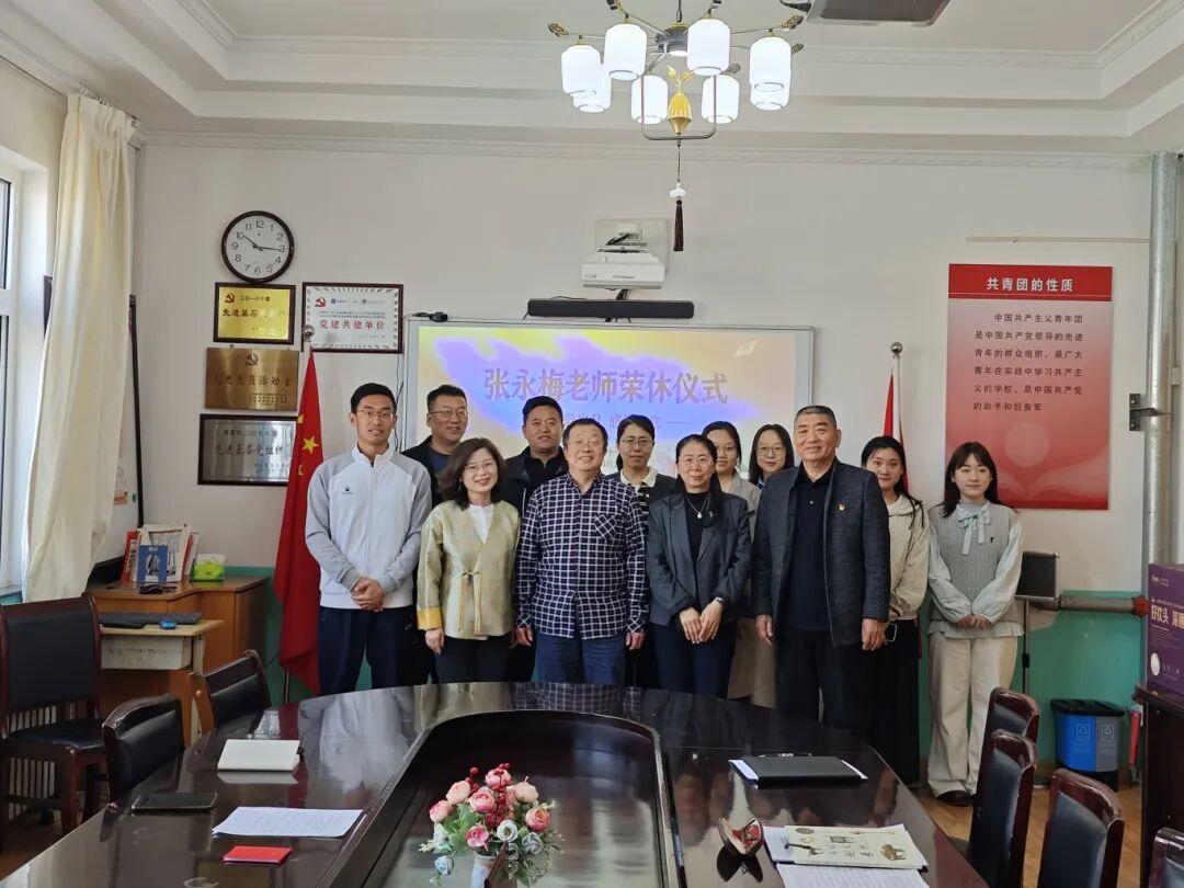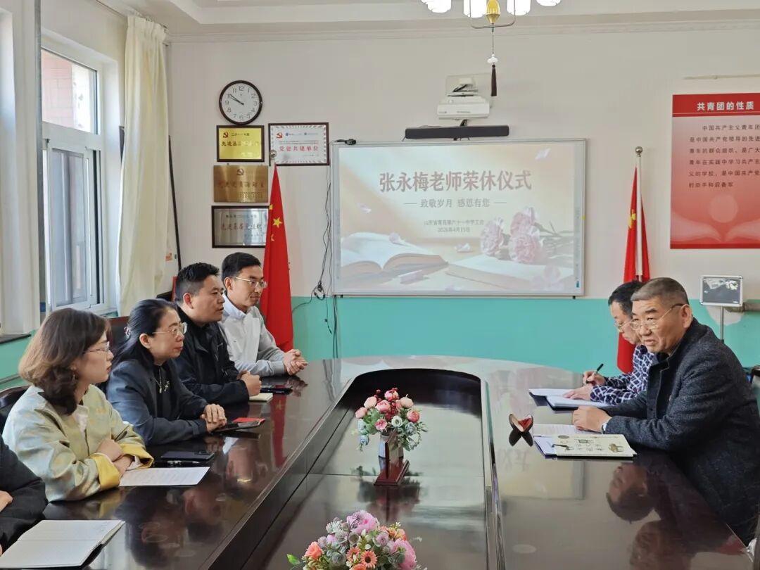 青岛六十一中正高级教师、省特级教师张永梅老师荣休仪式 4月15日举行,专职副书记赵振光主持,杨天世书记为张永梅老师颁发退休证、赠送纪念品并讲话。