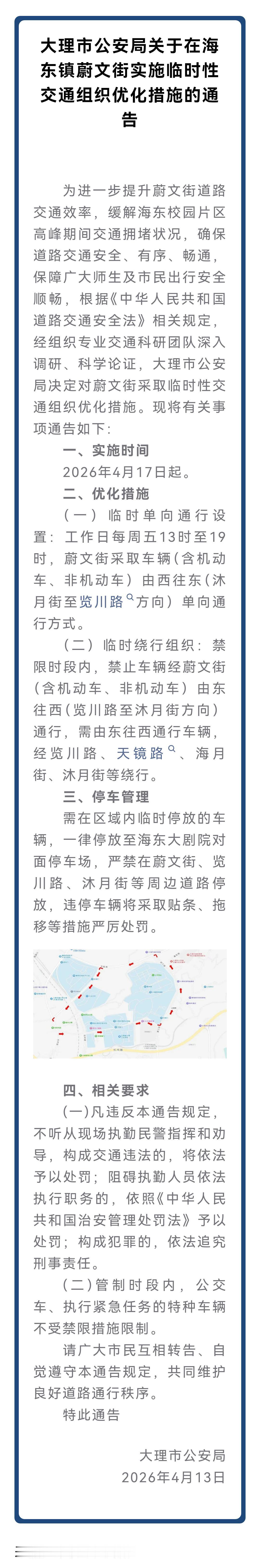 大理市公安局关于在海东镇蔚文街实施临时性交通组织优化措施的通告 为进一步提升蔚文街道路交通效率,缓解海东校园片区高峰期间交通拥堵状况,确保道路交通安全、有序、畅通,保障广大师生及市民出行安全顺畅,根据《中华人民共和国道路交通安全法》相关规定,经组织专业交通科研团队深入调研、科学论证,大理市公安局决定对蔚文街采取临时性交通组织优化措施。 现将有关事项通告如下: 一、实施时间2026年4月17日起。 二、优化措施 (一)临时单向通行设置: 工作日每周五13时至19时,蔚文街采取车辆(含机动车、非机动车)由西往东(沐月街至览川路方向)单向通行方式。 (二)临时绕行组织:禁限时段内,禁止车辆经蔚文街(含机动车、非机动车)由东往西(览川路至沐月街方向)通行,需由东往西通行车辆,经览川路、天镜路、海月街、沐月街等绕行。 三、停车管理需在区域内临时停放的车辆,一律停放至海东大剧院对面停车场,严禁在蔚文街、览川路、沐月街等周边道路停放,违停车辆将采取贴条、拖移等措施严厉处罚。 四、相关要求 (一)凡违反本通告规定,不听从现场执勤民警指挥和劝导,构成交通违法的,将依法予以处罚;阻碍执勤人员依法执行职务的,依照《中华人民共和国治安管理处罚法》予以处罚;构成犯罪的,依法追究刑事责任。 (二)管制时段内,公交车、执行紧急任务的特种车辆不受禁限措施限制。请广大市民互相转告、自觉遵守本通告规定,共同维护良好道路通行秩序。特此通告 大理市公安局 2026年4月13日