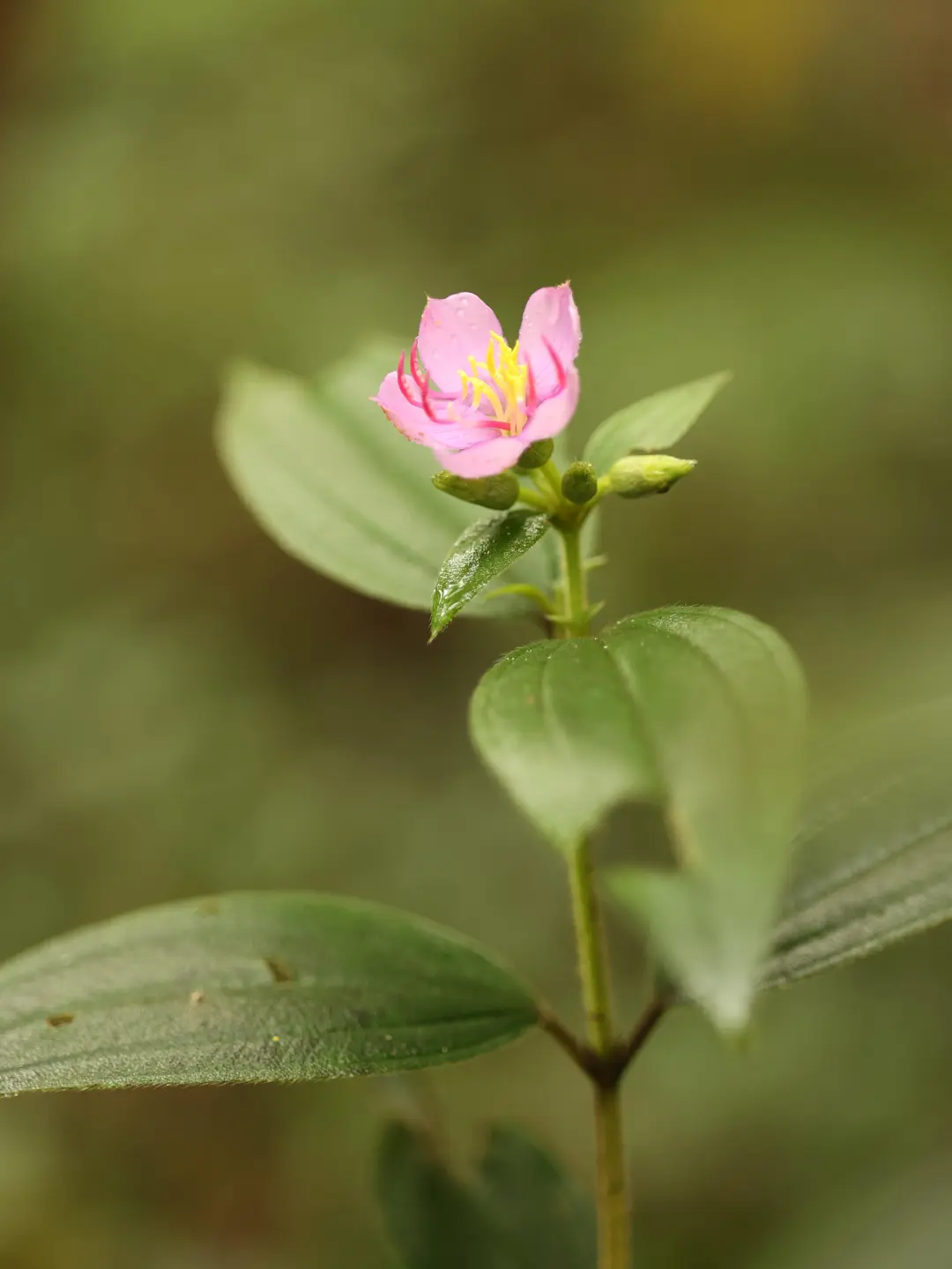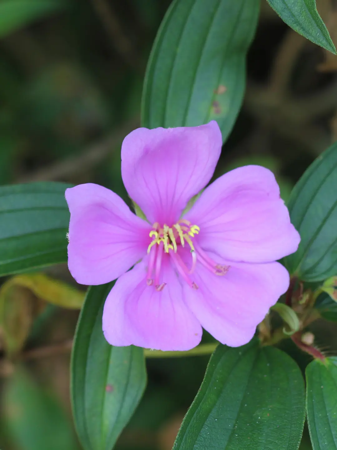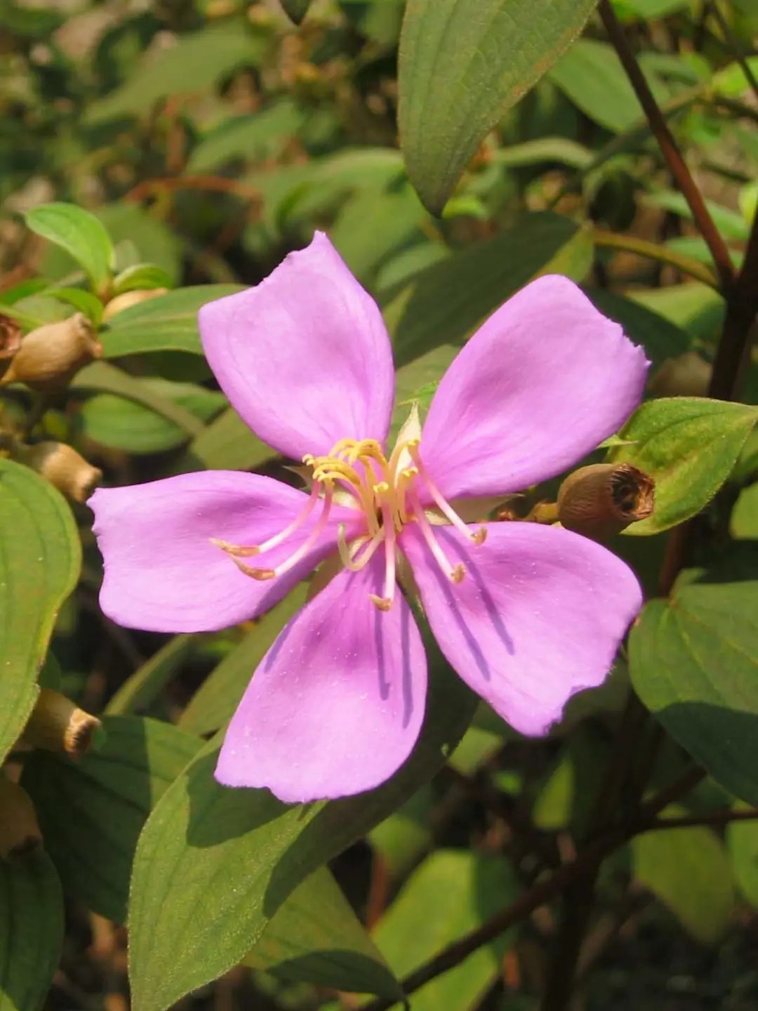 野牡丹不是野生的牡丹,它与牡丹之间完全没有亲缘关系。那么为什么取了这么一个让人误解的名字呢?据说是因为野牡丹虽生在山野之间,花却硕大而艳丽,在野花中显得极为吸睛,就如同牡丹在园林中的表现一样,因此得名。野牡丹原生于中国,而同科还有一种巴西野牡丹,一听就来自国外。它俩花与叶都非常相似,主要区别在于:野牡丹花朵粉色或玫红色,花蕊黄色;巴西野牡丹花朵紫色或蓝紫色,花蕊近似白色。