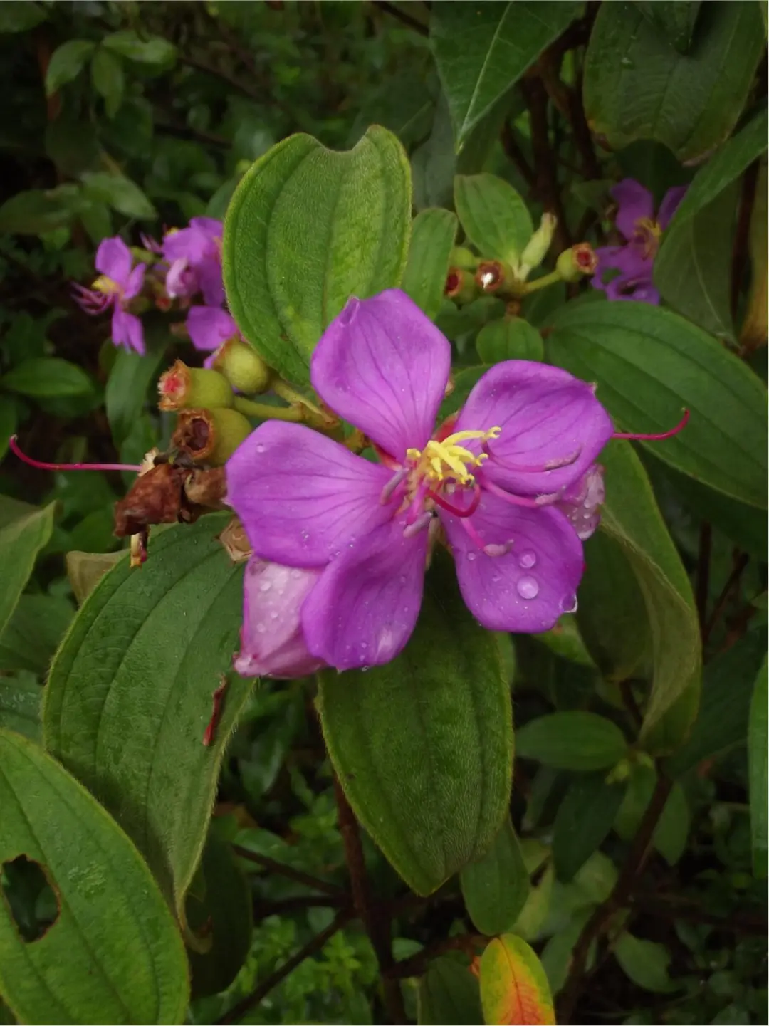 野牡丹不光初看惊艳,当我们仔细观察它,会发现它的花蕊长得非常奇特,形似一根根细长弯曲的爪子,显得非常精致。