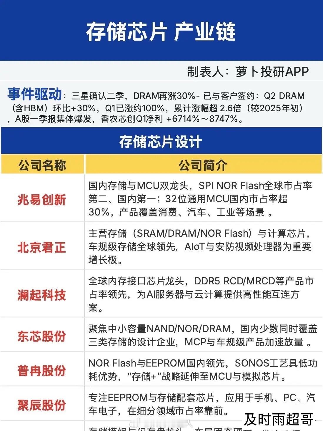 存储芯片概念梳理事件驱动:三星确认二季度DRAM再涨30%,已与客户签约Q2 DRAM(含HBM)环比上调约30%,Q1已出现明显涨价,较2025年初累计涨幅显著扩大。A股一季报表现活跃,香农芯创Q1净利预告同比大幅增长,叠加隔夜闪迪股价走强,存储芯片产业链关注度继续升温。以上内容仅作行业信息整理与学习参考。