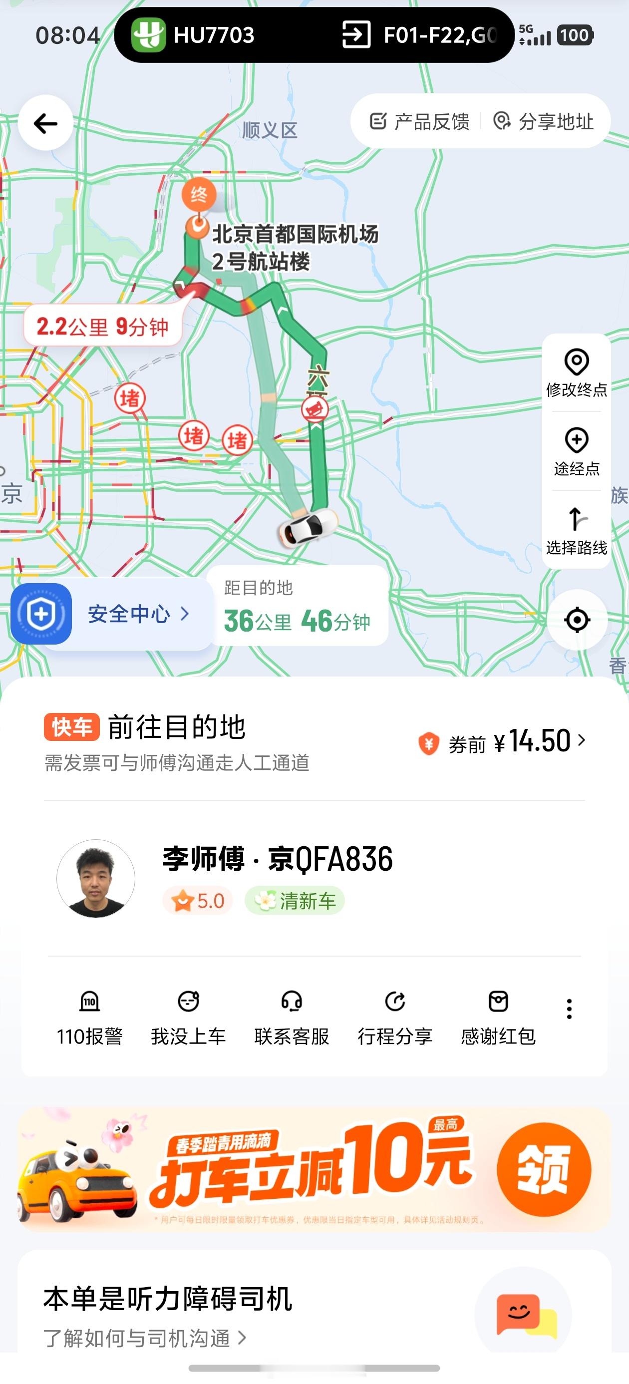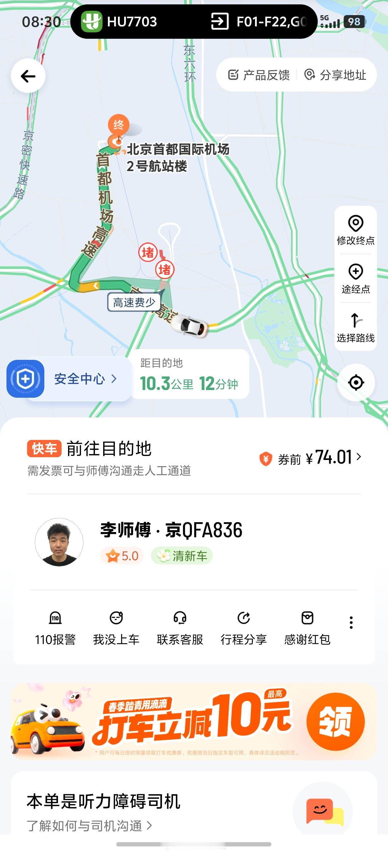 我瞅着个和前车车距较大的机会,赶紧拿手机给他看了一下,示意说我9点30起飞,麻烦他快一点