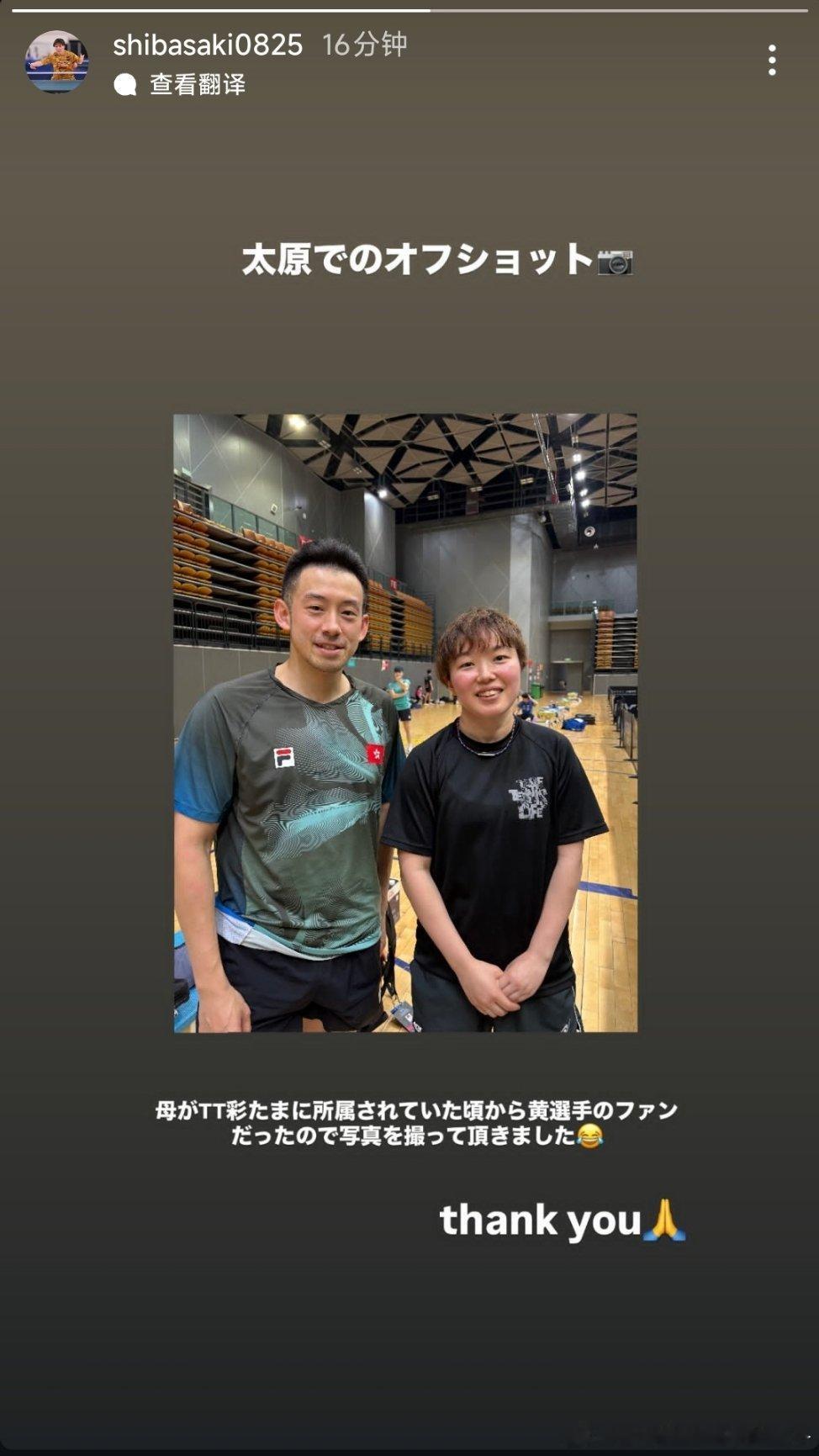 芝田沙季分享了和黄镇廷的合影:太原的合影📷从我母亲还效力于TT彩玉俱乐部时期起,就一直是黄选手的粉丝,这次终于有幸和他拍到了合照😂thank you🙏