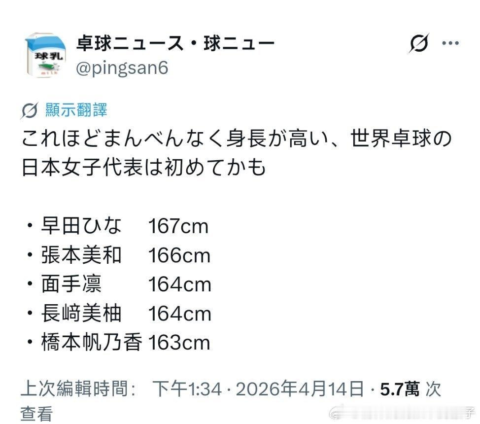 东电乒乓球相关栏目的研究员提出,伦敦世乒赛日本女队参赛选手的平均身高或许是历史历来最高的👀平均身高为164.8早田希娜 167cm张本美和 166cm面手凛 164cm长崎美柚 164cm桥本帆乃香 163cm