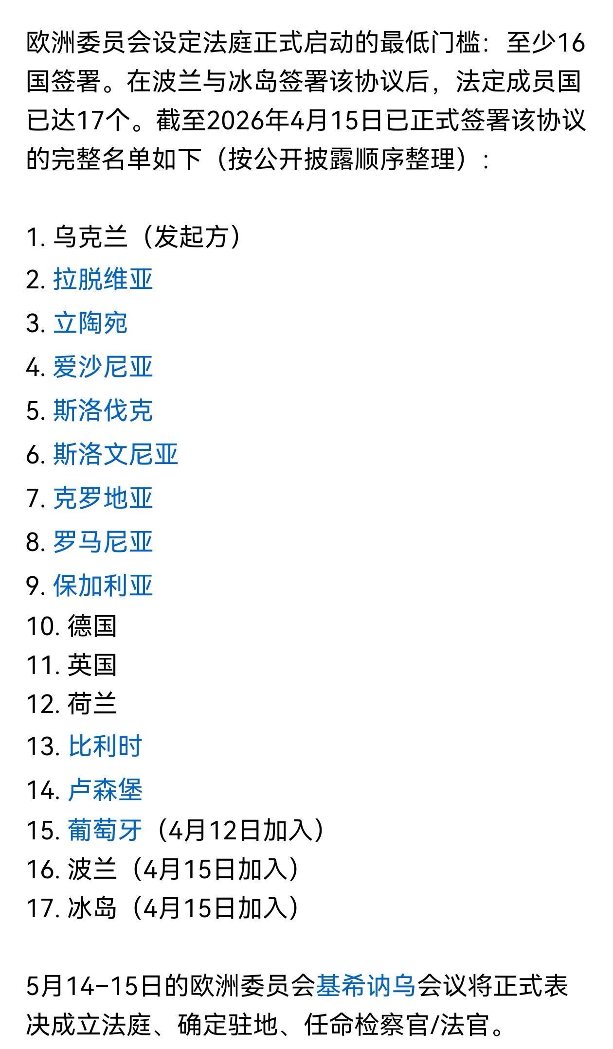 乌克兰外长瑟必加今天(4月15日)宣布,在乌克兰牵头下,“俄罗斯侵略乌克兰特别法庭”已达到泛欧组织欧洲委员会规定的最低门榄(16个成员国),今天正式启动。“我们已为法庭启动做好了全部法律准备,莫斯科的罪犯们必须明白,正义不可避免。从普通执行者到俄罗斯最高领导层,无一例外。” 欧洲委员会是一个泛欧洲组织,于1949年成立,总部位于法国的斯特拉斯堡,其主要工作范围是欧盟的人权、法治、民主、文化合作等,设有部长委员会、议会大会和人权法院等机构。现有46个成员国,俄罗斯也是其成员之一。对于乌克兰牵头成立的“俄罗斯侵略乌克兰特别法庭”将由欧洲委员会表决成立法庭、确定驻地、任命检察官和法官等,业务上归人权法院领导。 法庭成立后面临的问题:乌克兰要求受审的对象从普通执行者一直到俄罗斯的领导层,在乌克兰参战的俄罗斯普通士兵也是执行者,是否属于受审范围?其次,起诉对象被判决“有罪”后,有谁去执行?如何执行?