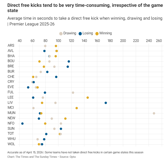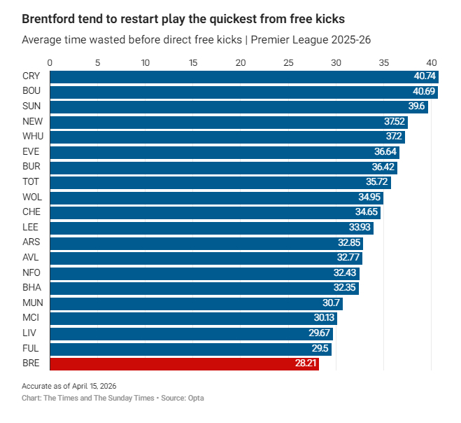 普通的犯规或越位任意球,是最常见的拖延方式。富勒姆与布伦特福德主罚任意球最快,但除水晶宫外,几乎所有球队在领先时,主罚任意球的耗时都长于平局时。