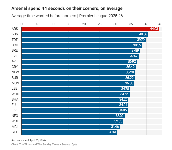 例如阿森纳场均耗时44.03秒主罚角球,为英超最长;桑德兰(40.56秒)与热刺(39.79秒)位列二三位。