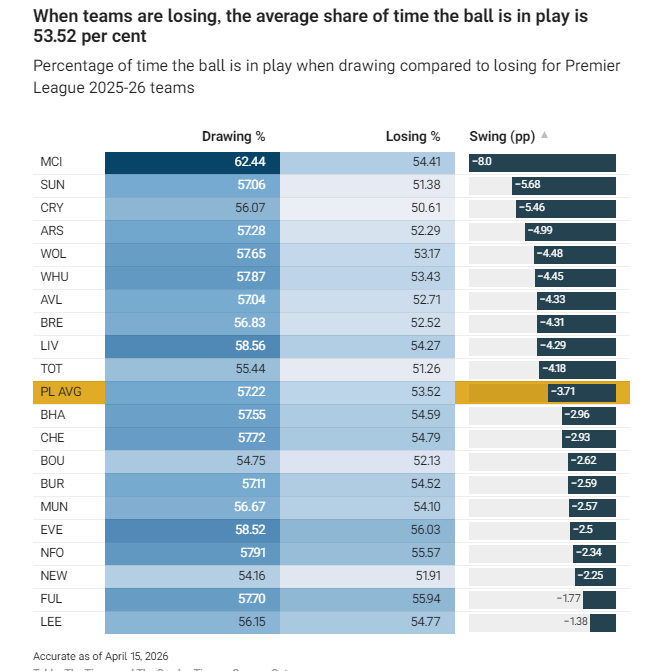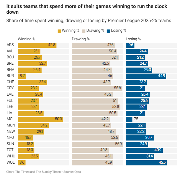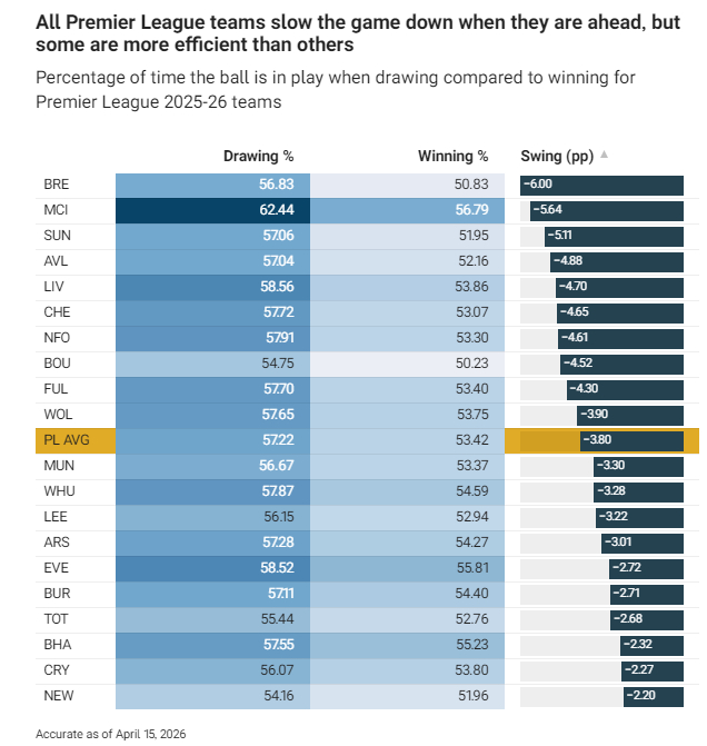 其中差值最为显眼的是曼城与切尔西:这两支平局时开球最快的球队,领先时分别多耗时13.76秒与12.88秒,阿森纳则以10.64秒紧随其后。