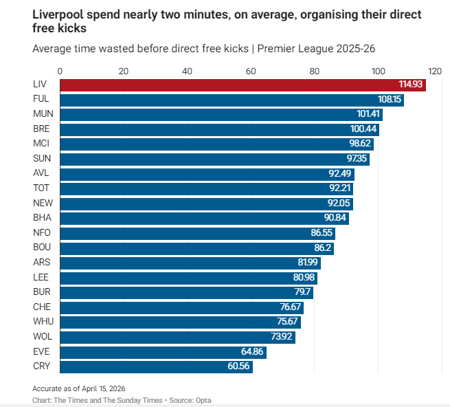 索博曾在安菲尔德对阵阿森纳、曼城、热刺的比赛中打入精彩直接任意球,他或许会认为这样的布置需要充足时间。不过利物浦在领先时,主罚任意球的节奏会明显加快。