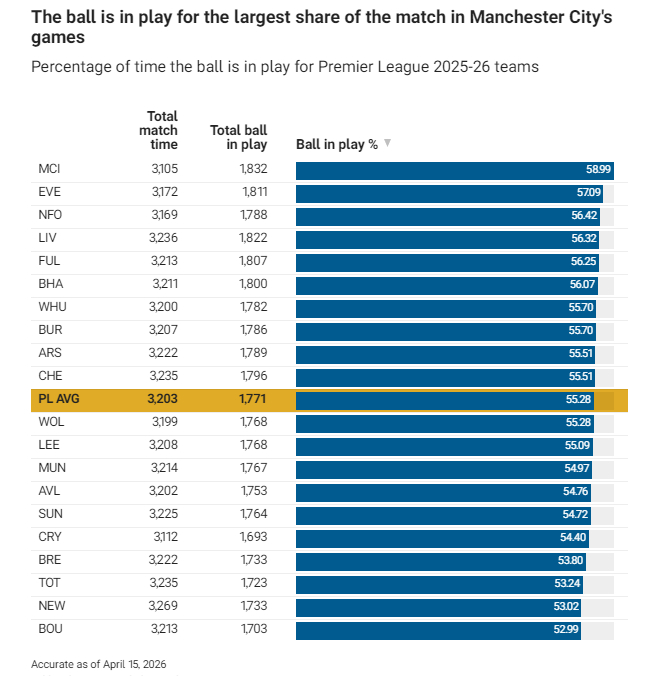 在分析具体细节前,不妨先看看有效比赛时间占比最高的球队。曼城以58.99%位居榜首,埃弗顿(57.09%)与诺丁汉森林(56.42%)紧随其后。联赛领头羊阿森纳(55.51%)略高于55.28%的联赛平均水平。