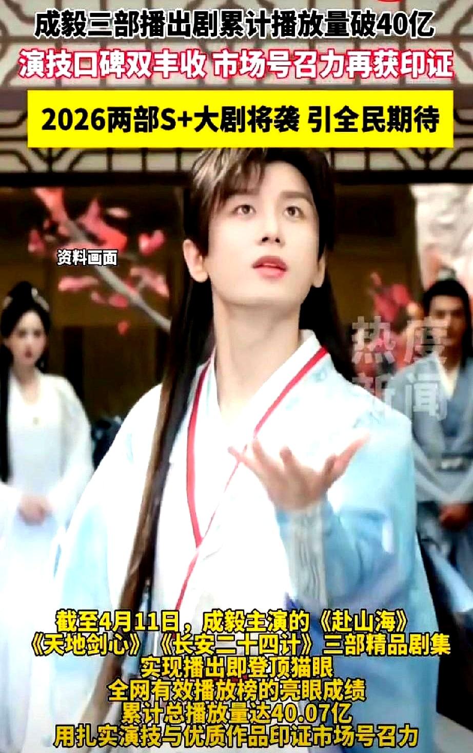 成毅在2025年交出的剧集数据确实很硬。 他播的三部剧累计播放量达到40.07亿。《赴山海》等三部作品每部都破了10亿,并且全部登过猫眼榜首。这些实打实的数据回击了关于他地位的讨论。 市场现在对他非常信任。2026年已经定下两部S+级别的大制作。已经杀青的《两京十五日》,也连续多周排在待播榜第一名,反响一直很好。 这种靠作品说话的节奏确实有说服力。大家更期待他的哪部新作品?