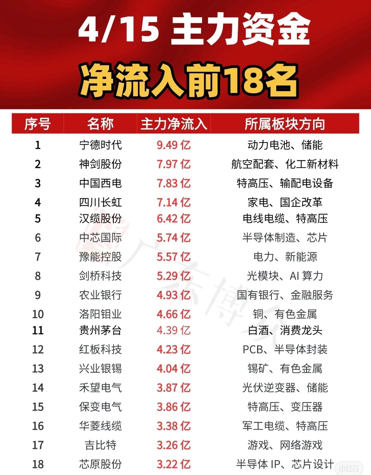 【4月15日主力资金净流入前18名榜单】 当日A股市场主力资金净流入排名前18的个股及所属板块方向如下: 1. 宁德时代 —— 主力净流入9.49亿元,所属板块:动力电池、储能 2. 神剑股份 —— 主力净流入7.97亿元,所属板块:航空配套、化工新材料 3. 中国西电 —— 主力净流入7.83亿元,所属板块:特高压、输配电设备 4. 四川长虹 —— 主力净流入7.14亿元,所属板块:家电、国企改革 5. 汉缆股份 —— 主力净流入6.42亿元,所属板块:电线电缆、特高压 6. 中芯国际 —— 主力净流入5.74亿元,所属板块:半导体制造、芯片 7. 豫能控股 —— 主力净流入5.57亿元,所属板块:电力、新能源 8. 剑桥科技 —— 主力净流入5.29亿元,所属板块:光模块、AI算力 9. 农业银行 —— 主力净流入4.93亿元,所属板块:国有银行、金融服务 10. 洛阳钼业 —— 主力净流入4.66亿元,所属板块:铜、有色金属 11. 贵州茅台 —— 主力净流入4.39亿元,所属板块:白酒、消费龙头 12. 红板科技 —— 主力净流入4.23亿元,所属板块:PCB、半导体封装 13. 兴业银锡 —— 主力净流入4.04亿元,所属板块:锡矿、有色金属 14. 禾望电气 —— 主力净流入3.87亿元,所属板块:光伏逆变器、储能 15. 保变电气 —— 主力净流入3.86亿元,所属板块:特高压、变压器 16. 华菱线缆 —— 主力净流入3.38亿元,所属板块:军工电缆、特高压 17. 吉比特 —— 主力净流入3.26亿元,所属板块:游戏、网络游戏 18. 芯原股份 —— 主力净流入3.22亿元,所属板块:半导体IP、芯片设计 —— 数据来源:当日主力资金流向统计,聚焦资金活跃度与行业热点方向。