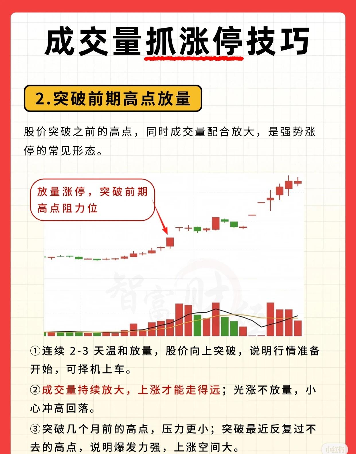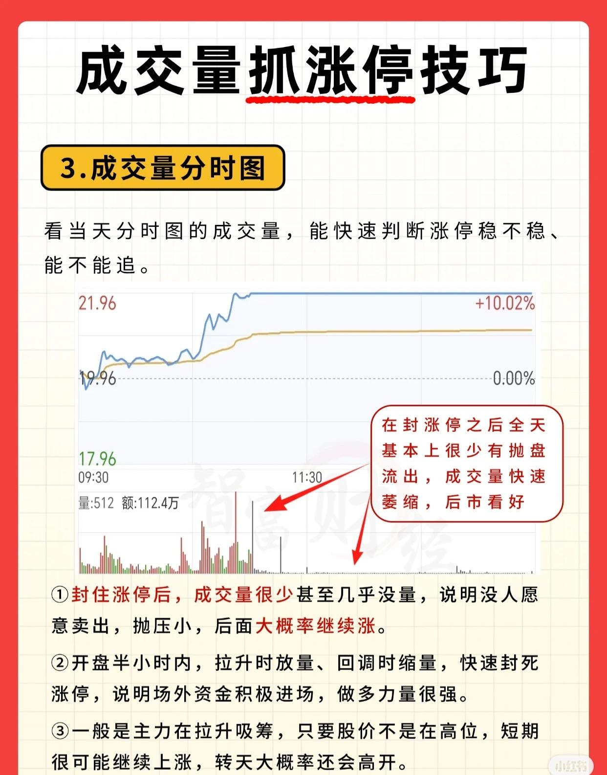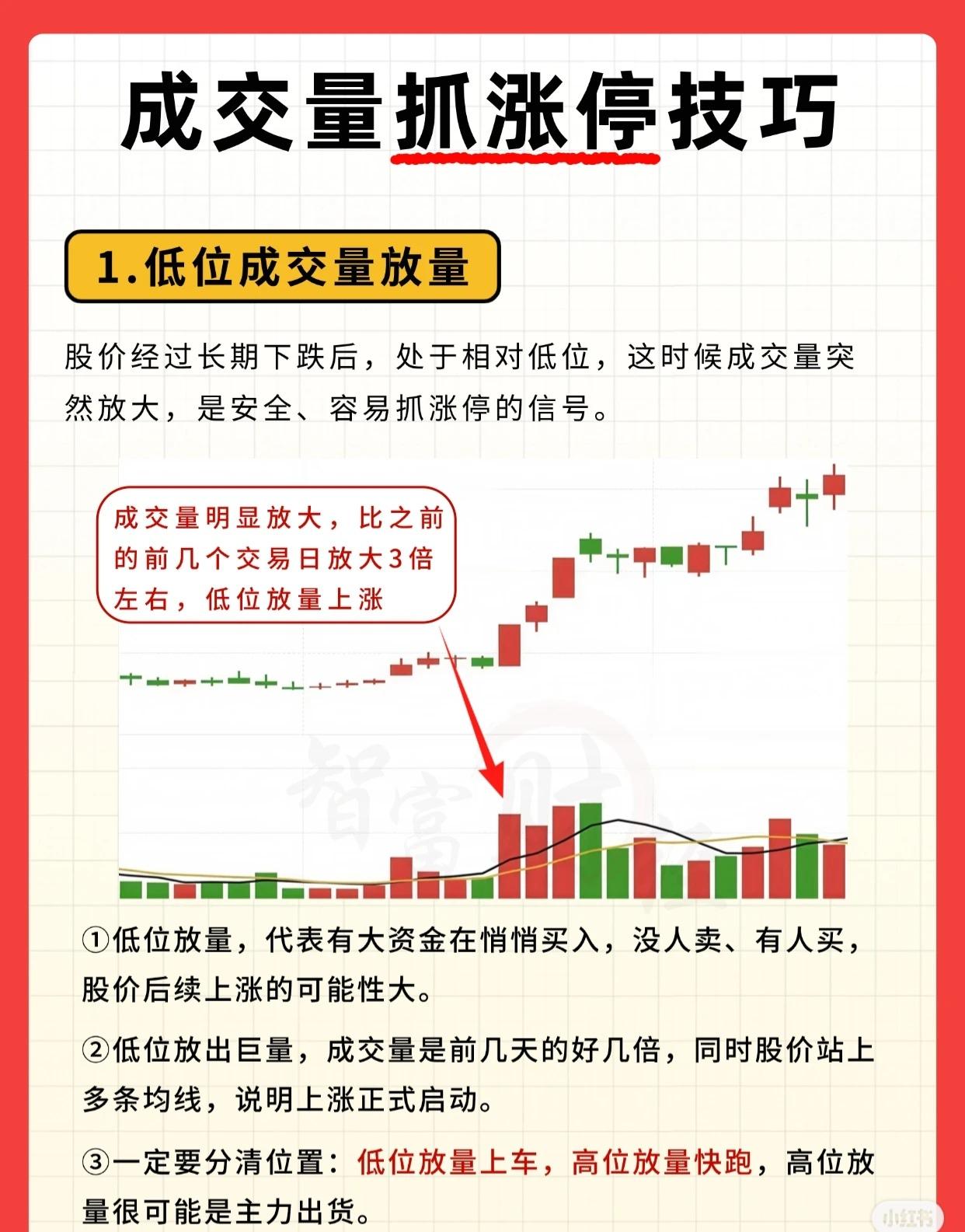 成交量抓涨停技巧 1. 低位成交量放量 股价经历长期下跌后,处于相对低位时,若成交量突然放大,这是安全且容易捕捉涨停的信号。 - 成交量明显放大,较前几个交易日放大3倍左右,伴随“低位放量上涨”的形态。 - 解读:① 低位放量意味着有大资金悄悄进场买入,此时卖盘稀少、买盘活跃,后续股价上涨概率大。② 若低位放出巨量(成交量为前几天的数倍),且股价站上多条均线,说明上涨行情正式启动。③ 务必分清位置:低位放量可择机“上车”,高位放量则需“快跑”——高位放量往往是主力出货信号。 2. 突破前期高点放量 股价突破此前的高点,同时成交量配合放大,这是强势涨停的常见形态。 - 典型表现为“放量涨停,突破前期高点阻力位”。 - 解读:① 连续2 - 3天温和放量后,股价向上突破,说明行情启动在即,可择机介入。② 成交量持续放大,上涨才能走得更远;若“光涨不放量”,需警惕冲高回落风险。③ 突破几个月前的高点,压力更小;突破最近反复受阻的高点,说明爆发力强,上涨空间更大。 3. 成交量分时图 观察当天分时图的成交量,可快速判断涨停是否稳固、是否值得追入。 - 核心特征:封涨停后全天几乎无抛盘流出,成交量快速萎缩,后市看好。 - 解读:① 封住涨停后,成交量极少甚至近乎无量,说明抛压极轻、无人愿卖,后续大概率继续上涨。② 开盘半小时内,拉升时放量、回调时缩量,且快速封死涨停,说明场外资金积极进场,做多力量强劲。③ 这通常是主力拉升吸筹的信号,只要股价不在高位,短期大概率延续上涨,次日也大概率高开。 (注:所有技巧需结合市场环境、个股基本面综合判断,不可单一依赖成交量信号。)
