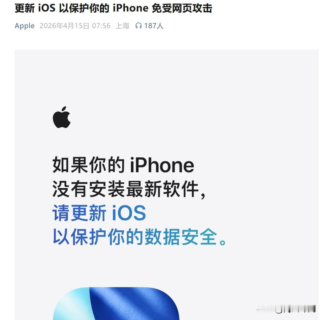 4月15日,苹果官微紧急提醒:旧版iOS存在网页安全漏洞,用户点开恶意链接可能导致数据被盗,已发布更新修复,无法更新的建议开启锁定模式 。这已经是今年苹果第三次发安全预警,看着身边不少人还在死守旧系统,真的很担心。 说实话,这次漏洞的危害比想象中大:黑客不用装APP,只要你点个链接就可能导致数据被盗。很多人不愿更新,无非是怕卡顿、怕功能变了,但在数据安全面前,这些理由站不住脚。 说到这,我一直在想:为什么我们总盯着苹果的漏洞,却忽略了国产手机的进步?现在的鸿蒙、MIUI等系统,早就不是以前的样子了。比如鸿蒙的微内核架构,攻击面比传统系统小很多,还有国密级加密、实时权限拦截,这些都是底层防护。而且国产系统更懂国内用户习惯,广告推送、权限管理都更贴合我们的需求,也在不断优化隐私保护。 你们觉得这次苹果漏洞,会有人转投国产手机吗?