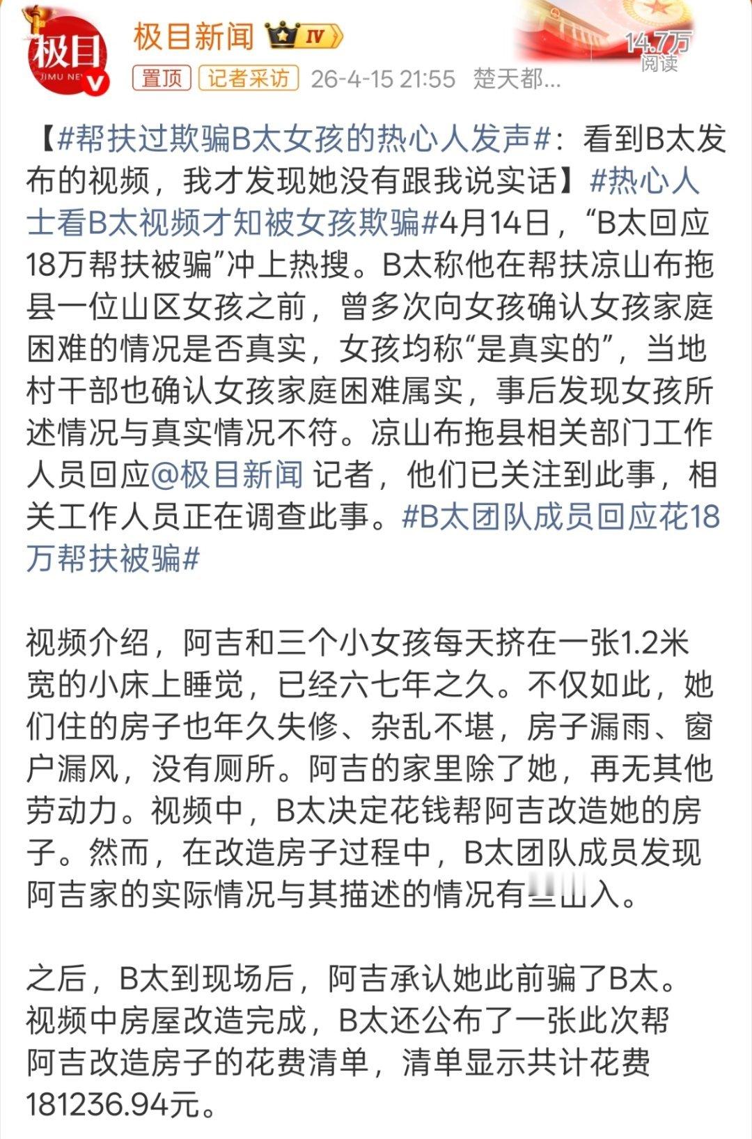 帮扶过欺骗B太女孩的热心人发声感觉背后甚至有可能是团队操作,就是为了骗好心人的捐款。