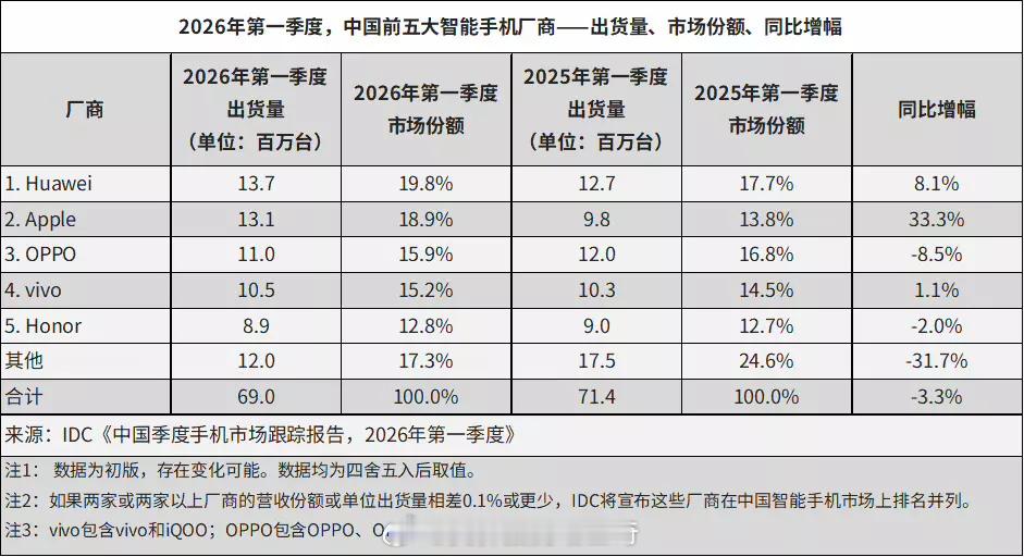 IDC的中国手机市场排名,华为第一,苹果第二,OPPO第三,vivo第四,荣耀第五。