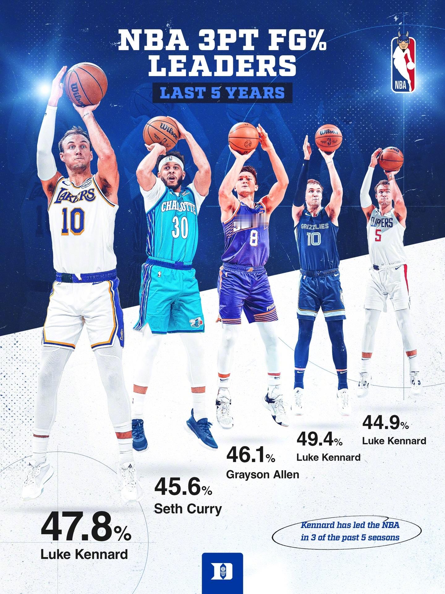 肯纳德本赛季以47.8%的三分命中率登顶联盟三分命中率第一,加上他的校友赛斯-库里还有格雷森-阿伦,三位杜克球员已经包办了近五个赛季的联盟三分命中率第一人了。