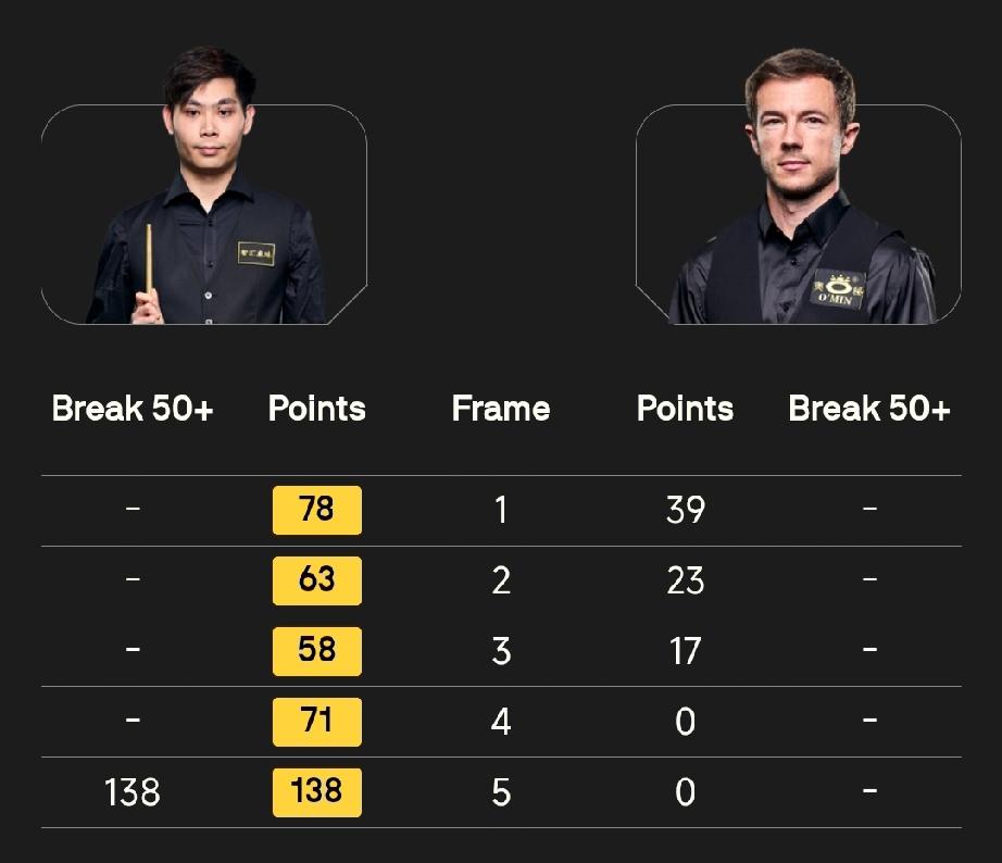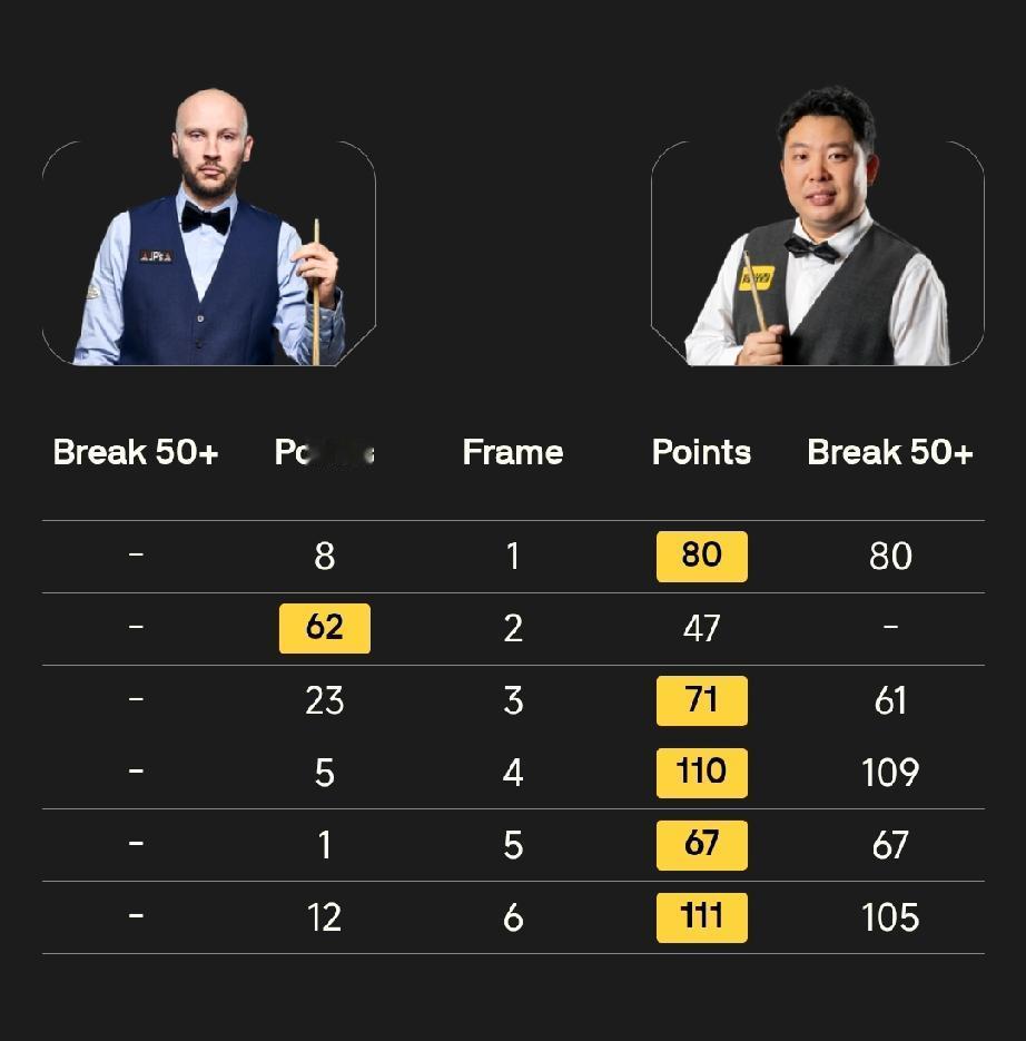 国 强 5-0 杰克·利索夫斯基 张安达 5-1 扎克·舒尔蒂 4月15日,斯诺克世锦赛资格赛第四轮,中国五将登场。 贺国强和张安达发挥出色,贺国强打出单杆138分,5-0领先杰克·利索夫斯基;张安达打出两杆破百三杆50+,5-1领先扎克·舒尔蒂。
