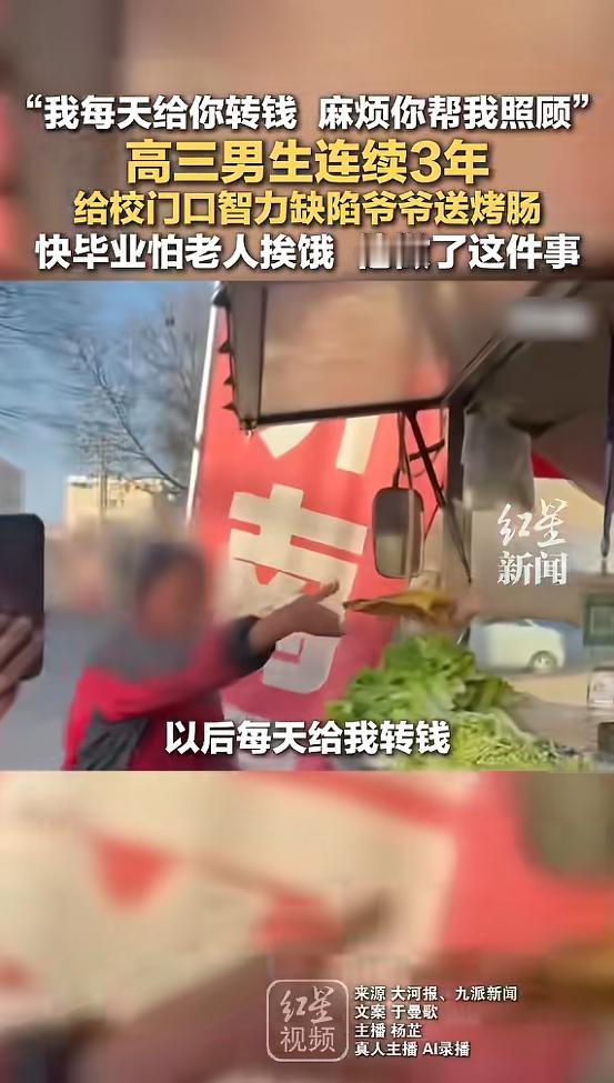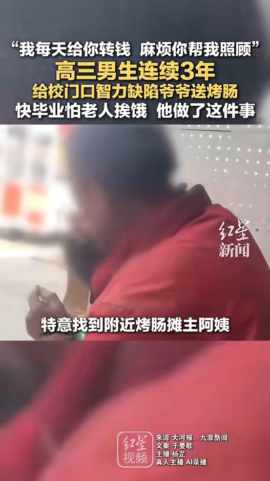 看哭了!山东潍坊,一高三男生连续3年,给校门口有智力缺陷的爷爷送吃的,眼看他快要毕业,担心爷爷挨饿,所以找到附近摆摊的阿姨,愿意每天转钱,拜托她照顾爷爷,阿姨被深深打动,没收男生的钱,承诺会一直给老爷爷送吃的!网友:都是善良的人! 事情发生在潍坊寿光中学门口,这位高三的刘同学,刚上高一的时候,就注意到了校门口总坐着一位老人。 老人七十多岁,智力有些缺陷,话都说不完整,大家都叫他“二娃”,平时就在街上转悠,饿了就只能翻翻垃圾桶,看着特别让人心疼。 从那天起,刘同学心里就放不下了,每次路过看到老人,都会顺手买根烤肠、几个包子或者一瓶水递过去。 这件事,他一做就是三年,一千多个日子,没有告诉过老师同学,也没有拍过照发过朋友圈,就这么安安静静地坚持着。 他自己说,就是觉得老人可怜,不会照顾自己,自己多买一根烤肠,也不费事。 老人虽然表达不清楚,但每次接过吃的,眼里都透着高兴,这份无声的互动,成了刘同学高中三年里一件很自然的小事。 时间过得快,转眼就到了毕业季,刘同学马上要参加高考,离开学校去上大学,他一想到自己走了之后,老人可能就要挨饿,心里就特别着急。 他想,必须找个人把这份照顾接过去,思来想去,他找到了学校附近卖烤肠的管凯欣阿姨。 他腼腆地找到管阿姨,加上微信,开口就说想每天转钱,麻烦阿姨每天给老人送一根烤肠。“我怕我毕业走了,他会挨饿。”就这么一句朴实的话,管阿姨当场就被打动了,眼泪忍不住往下掉。 她怎么可能收孩子的钱,她当即就拒绝了转账,斩钉截铁地告诉刘同学:“钱我一分不要,这位爷爷我管定了,你放心去考大学!” 让人更感动的是,管阿姨其实从2020年开始摆摊,就已经默默照顾这位老人六年了,平时老人过来,她都会主动给吃的。 不止是她,这条街上的其他摊主、店家,也都心照不宣,你给一口饭,我送瓶水,早就形成了默契,只是大家都没声张。 刘同学三年的坚持,和这条街长久以来的善意,在这一刻交汇了。 事情被管阿姨发到网上后,一下子就火了,全网几十万网友点赞评论,大家都被这份朴素的善良打动。 随后,阿里公益天天正能量还为刘同学颁发了五千元奖金,他一分没留,全部捐出去用于帮助残疾人。 当地社区也更加关注老人的生活,给他落实了低保和残疾人补贴,家人也把他照顾得更好。 现在,管阿姨的摊位上,每天都会特意留一根温热的烤肠给老人,这份善意,还在稳稳地传递着。 这件事看着不大,却特别有力量,一个高三学生,用三年的课间碎片时间,做了一件不图回报的小事;一位摆摊的阿姨,用自己的方式,默默守护了老人六年。 他们都没觉得自己在做什么惊天动地的善举,只是觉得“顺手帮一下”,可就是这种发自内心、不求名利的善良,最能打动人。它不是一时兴起的作秀,而是刻在骨子里的教养和温柔。 网友们看完也是感慨万千,有网友说:“善良是会传染的,一个少年温暖了一座城,这才是年轻人该有的样子。” 也有网友冷静地说:“感动归感动,也希望社会福利能更完善,让这些弱势群体能得到更稳定、更专业的照顾,而不只是靠好心人自发帮忙。” 其实我们身边从不缺这样的温暖,它可能就藏在一根烤肠、一句问候里,不声不响,却能在关键时刻,照亮别人的生活。 愿我们都能守住心底那份柔软,在别人需要时,伸手帮一把,让这份朴素的善意,一直传下去。 对此您有什么不同的看法,可以在评论区留言讨论!!!