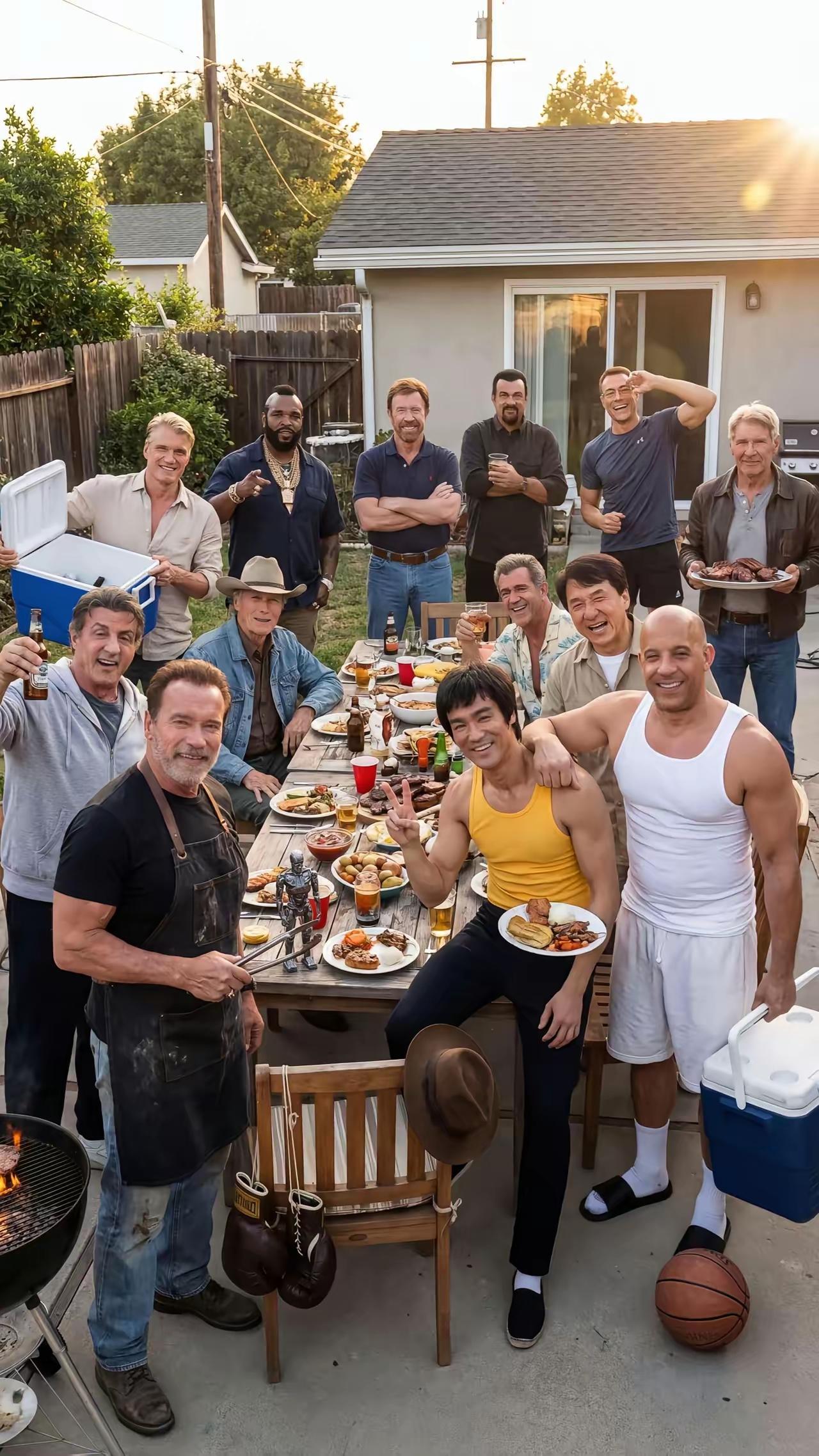 看到这画面,心跳都快了!成龙、李连杰、史泰龙、施瓦辛格……这些动作片老面孔齐聚后院烧烤,笑容硬朗,肌肉依旧。他们用拳头和汗水,为我们筑起青春的热血堡垒。从《警察故事》到《终结者》,从《黄飞鸿》到《敢死队》,他们不只是演员,更是勇气的化身。致敬那个没有特效却最真实的硬汉黄金时代——他们的背影,是我们永远的信仰。